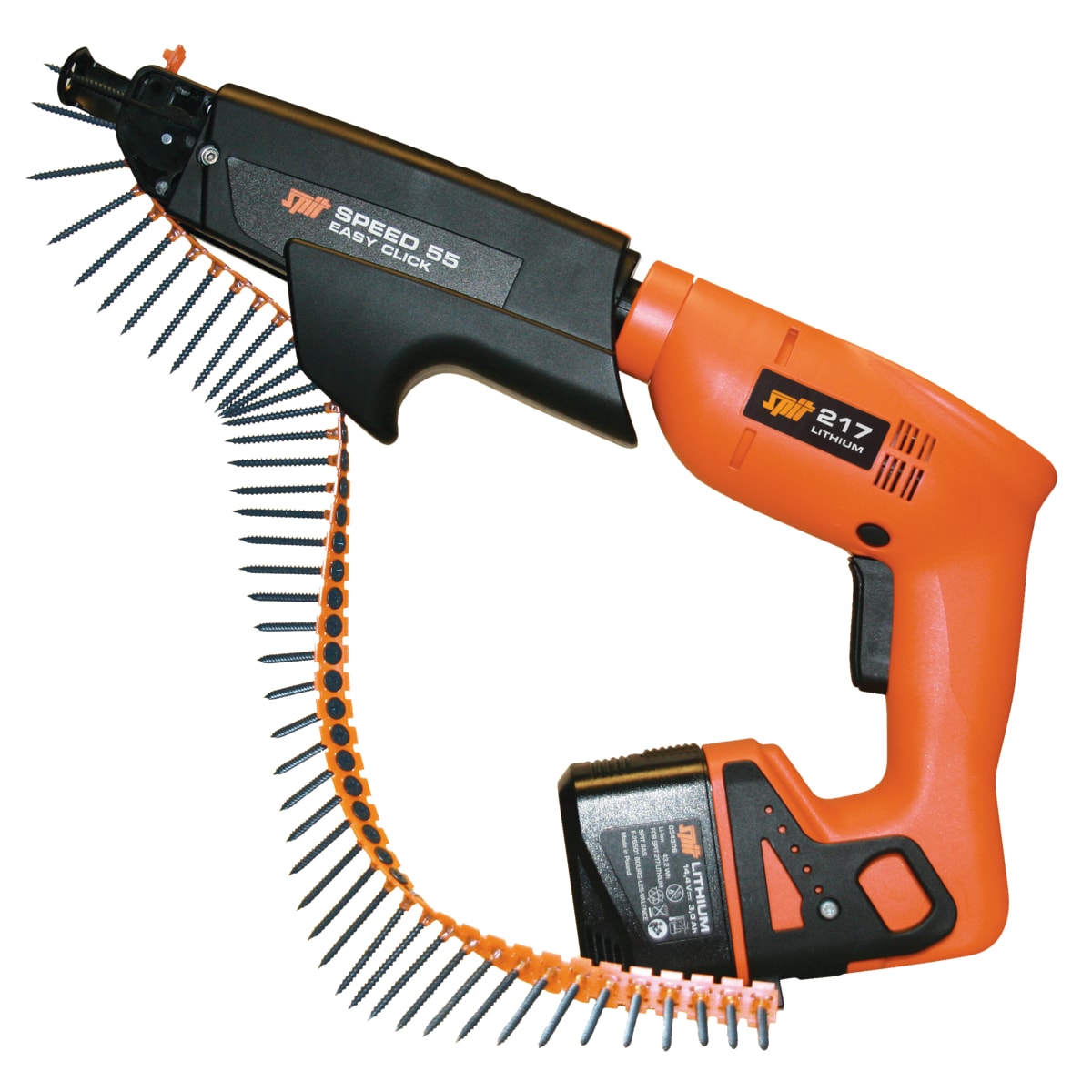 Cordless drywall screwdrive kit is available with the Speed Easy Click magazine which auto feeds 50 screw strips for greater productivity when fixing plasterboard to metal or wood.
