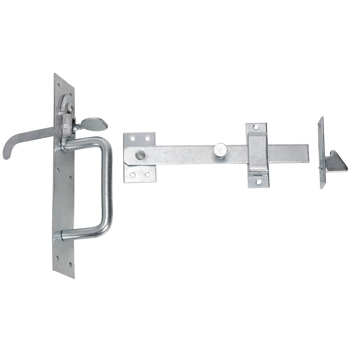This metal Suffolk latch is for wooden gates and doors that need to be opened from either side. The classic design has been around for nearly 150 years and the look suits many rural situations. It has three components: the back plate, latch and keep. The back plate supports the handle and thumb catch to lift the lever. A slot is cut right through the wood to accept the lever and then the back plate is screwed down. The latch assembly has a bar, hinged at one end, with a knob for lifting and a jump staple to keep the bar aligned. The latch is mounted on the other side of the door from the back plate at a height where the lever lifts the latch bar when the thumb latch is pressed. The keep goes on the gatepost or doorframe and the latch bar drops into it, securing the gate or door.