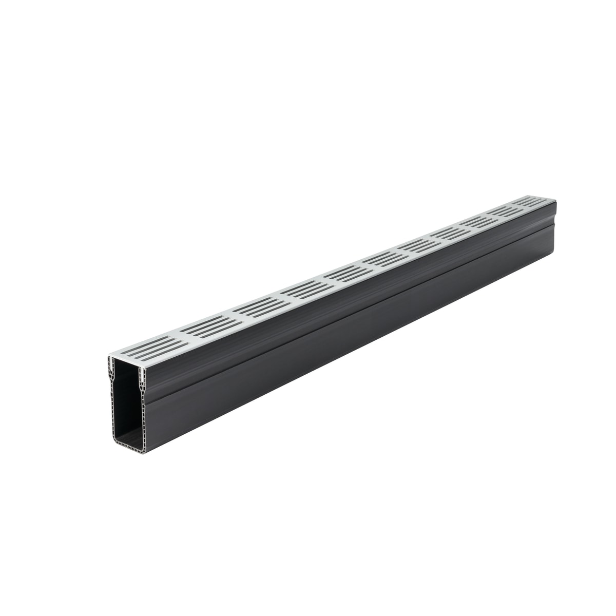 Manufactured from extruded plastic with an aluminium or steel grating, Threshold Drains eliminate water ponding at house entrances, or around your patio.Supplied complete with either a silver or black aluminium, CorTen steel or stainless steel Heelguard grating suitable for pedestrian traffic.The discreet system has a width of 60mm and is available in 1m lengths.With a range of accessories available from corner units to ø110mm vertical outlets, making them ideal for a modern patio drainage system.Suitable for use in Building Regulations Part M compliant installations in England and Wales and Building Standards Section 4 compliant installations in Scotland.