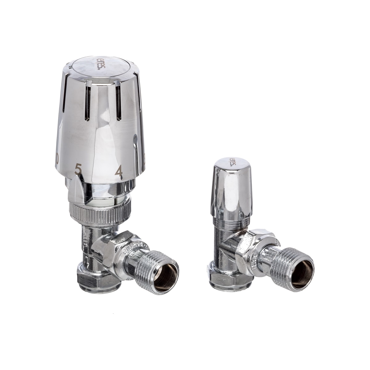 Eres 15mm Chrome Corner Thermostatic Radiator Valve Twin Pack- Angled. Liquid Filled Trv Head With Frost Setting. Chrome Finish.