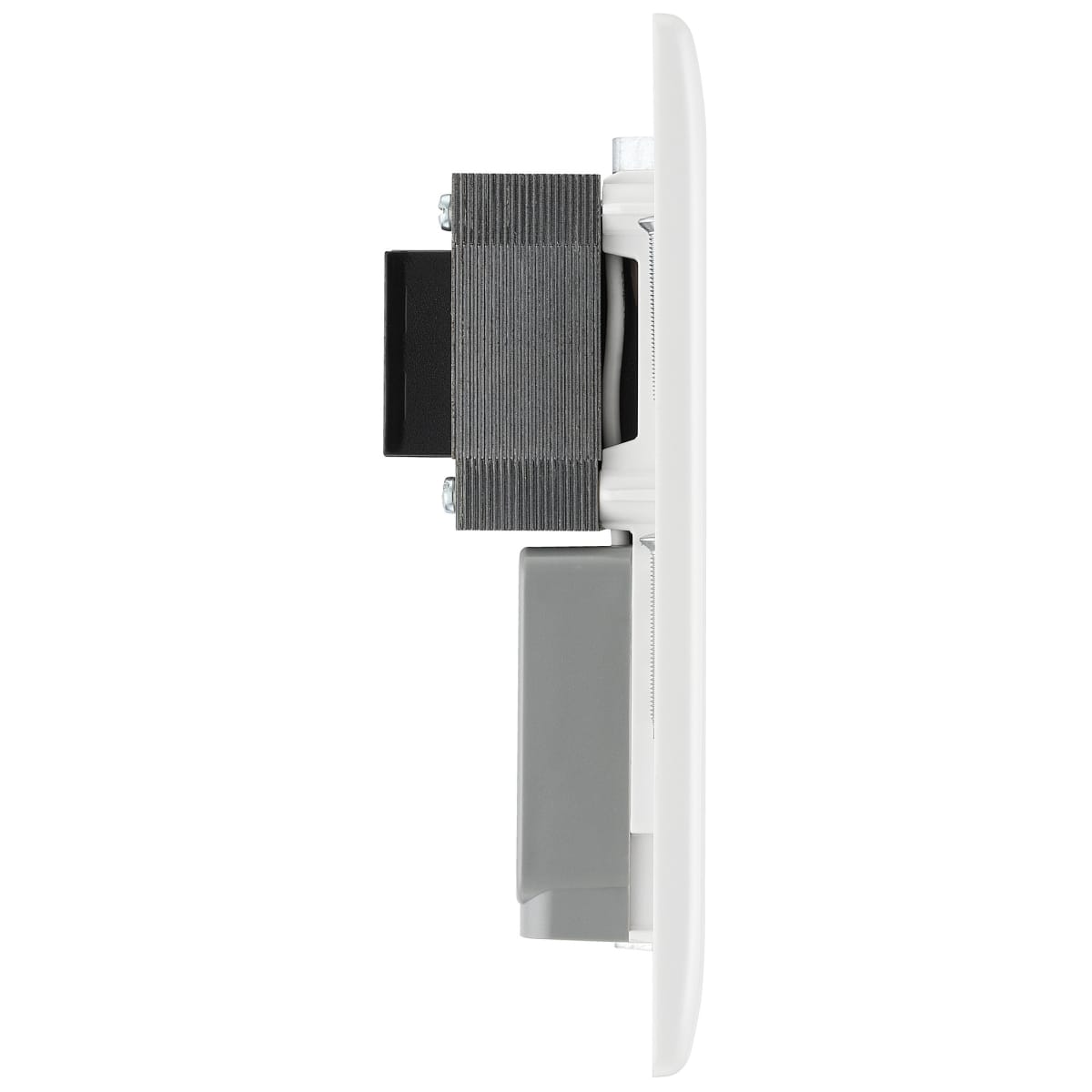 This BG 800 Series White Moulded dual voltage 115/240V shaver socket has round edges and comes with in-line terminals for easy installation. It's highly resistant to fading and scratches and has anti-microbial properties. Minimum mounting box 47mm, ideal for electric shavers and toothbrushes.