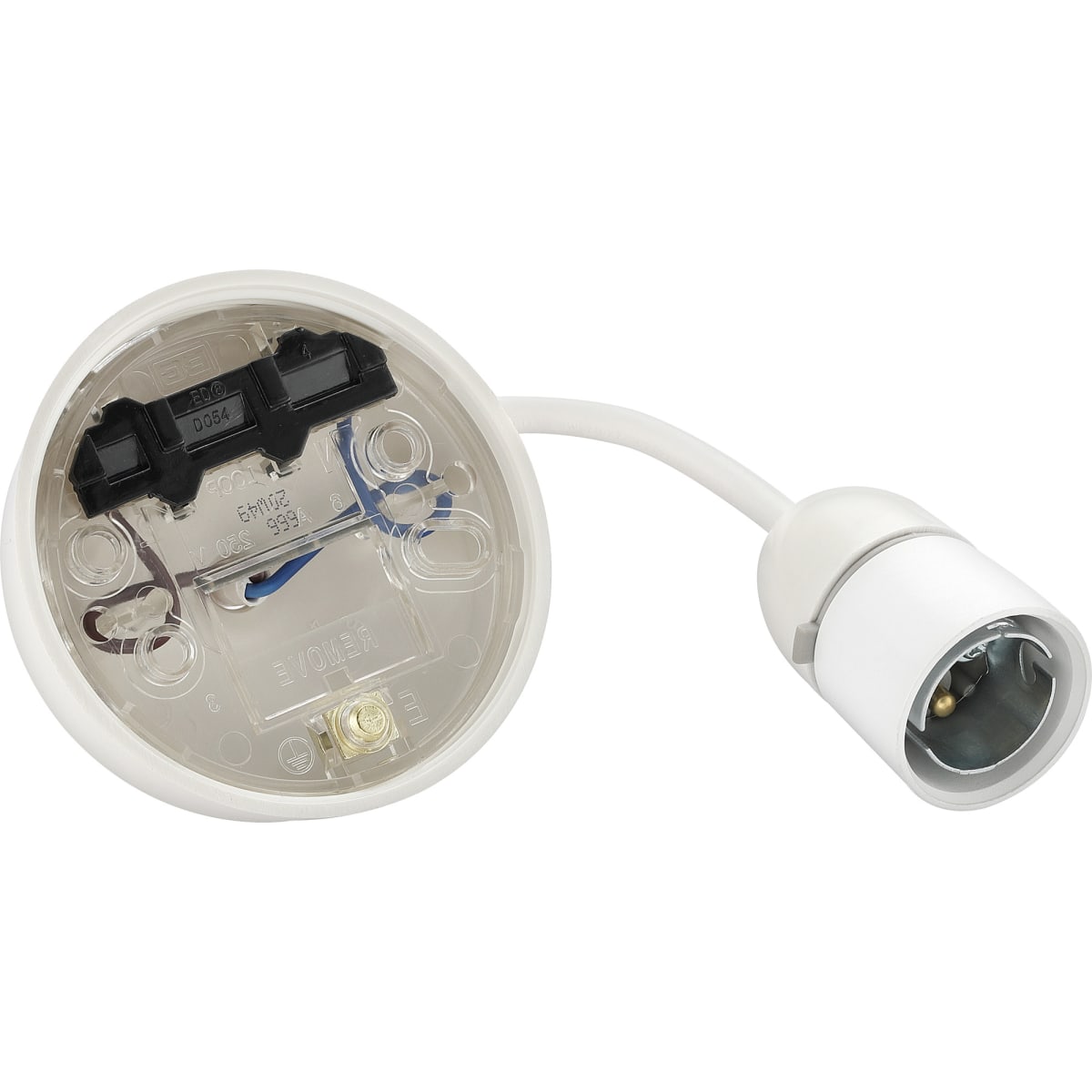 This BG pendant lamp holder set supports B22 bulbs (150W max). Prewired with a 6" flex, with smooth cable entry with spin on cover for the 3" ceiling rose. Features 8 cable entries with captive screws and large capacity earth terminal in the base. Alternative fixing holes for off centre mounting.