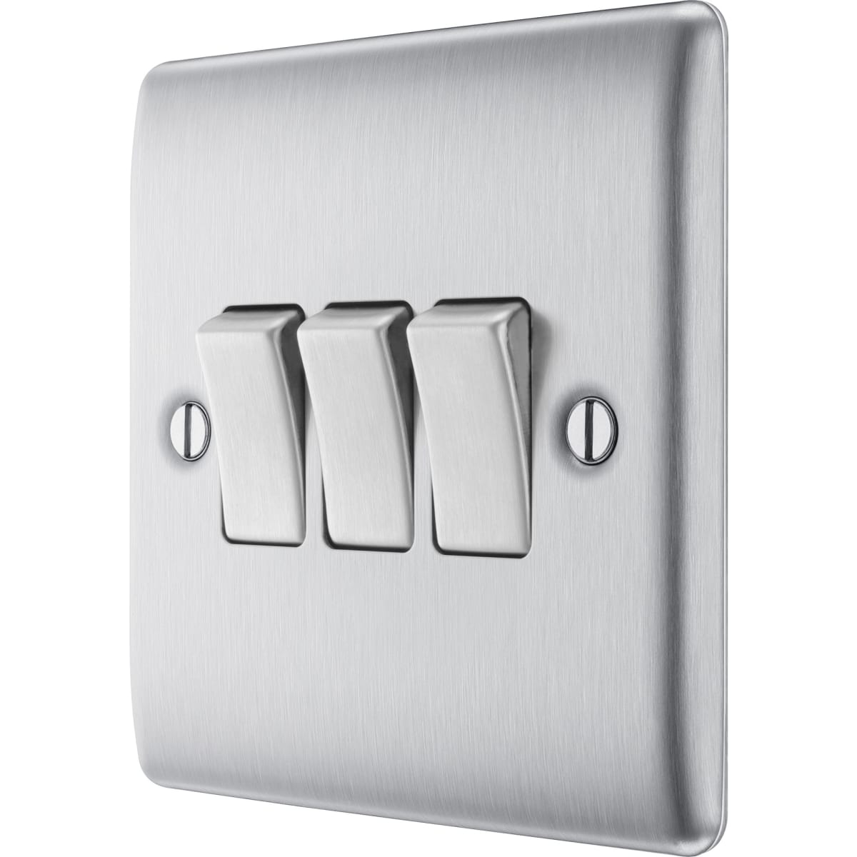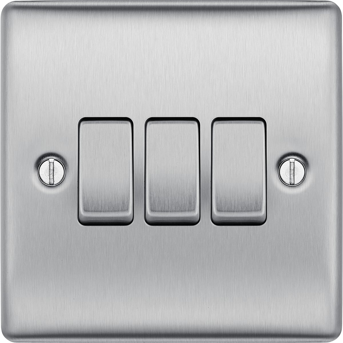With a sleek profile and rounded edges, this 20A 2-way triple light switch in brushed steel from the BG Nexus Metal range has no visible plastic around the switches and a moisture control gasket to protect edges from tarnishing. Easy to install with backed out screws and fits a 25mm back box.