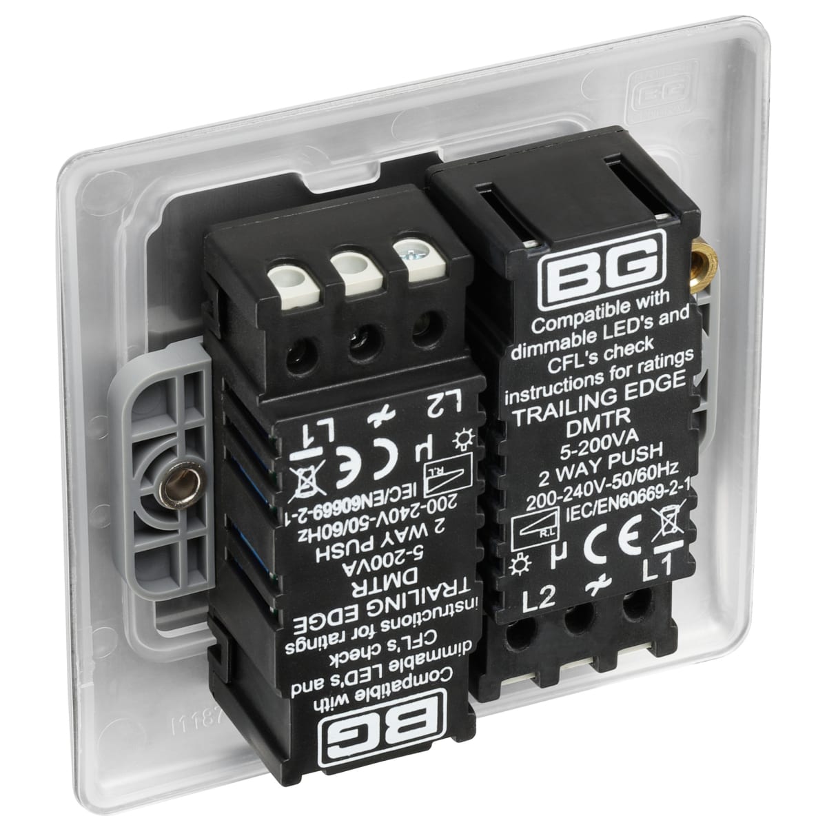 With a sleek profile and rounded edges, this intelligent double dimmer switch in brushed steel from the BG Nexus Metal range has no visible plastic around the dimmer and a moisture control gasket to protect edges from tarnishing. Featuring overload protection and fits a 25mm back box.
