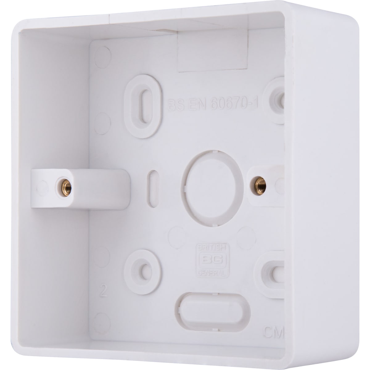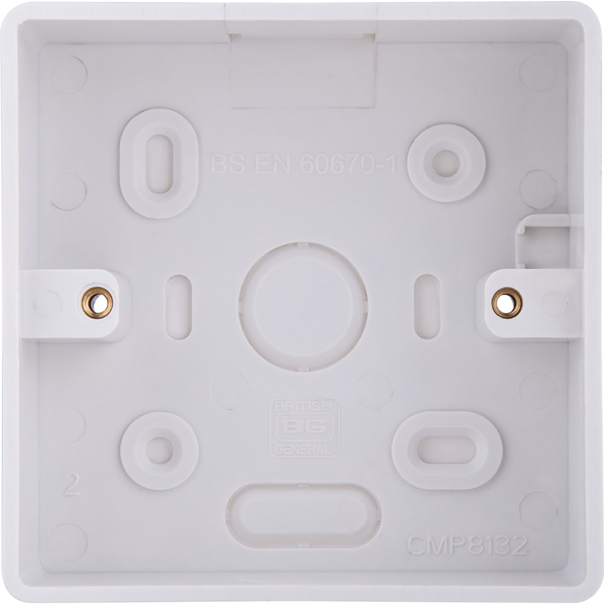 This PVC surface mounted box from British General can be used for surface mounting wiring accessories. The knockouts in the pattress enable connection to conduit or mini trunking, whilst the PVC material allows these to be cut and drilled easily to enable cable access. The rounded corners make this ideal for use with items from the BG 800 series range.