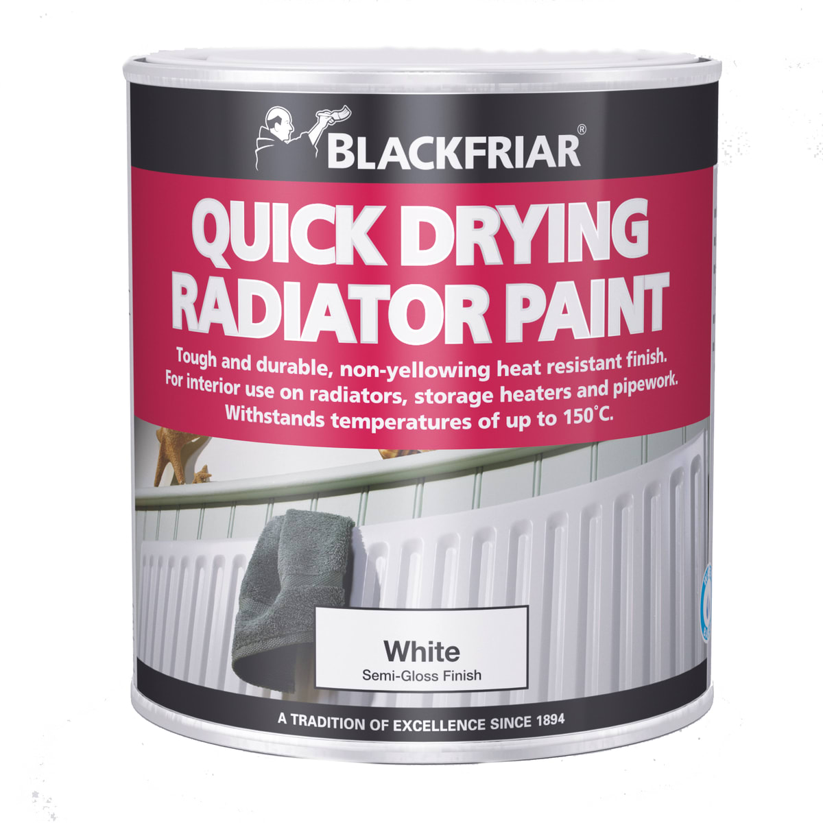 Blackfriar Quick Drying Radiator Paint 500ml White provides protection from high temperatures up to 150 degrees Celsius. It is a water based non-yellowing solution for interior usage. Has a touch dry time of 1 hour. The drying time is dependent on an ambient temperature and relative humidity.