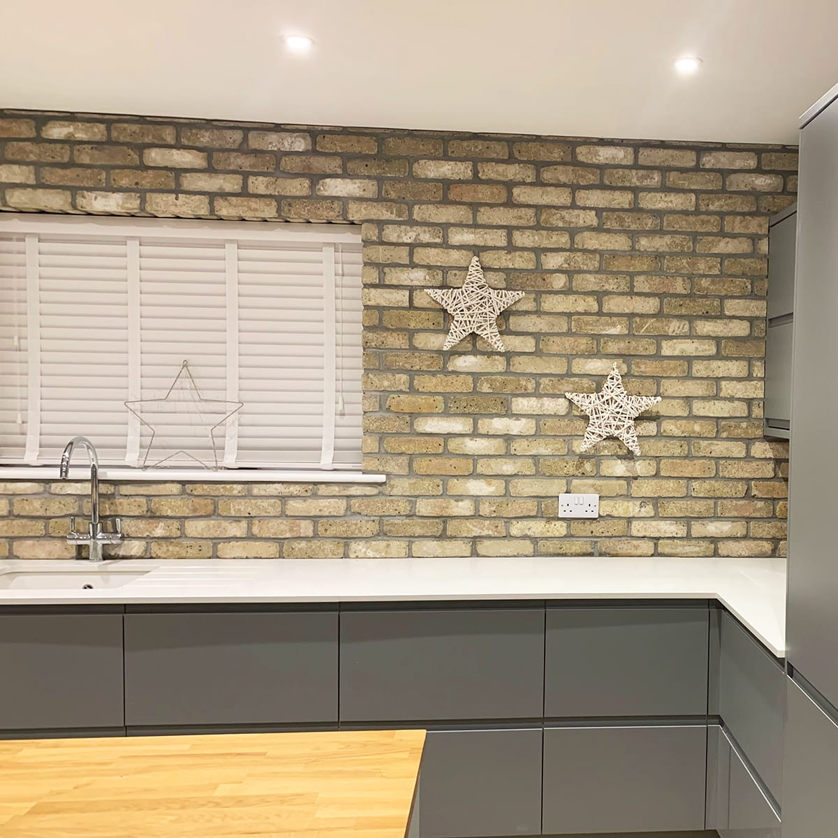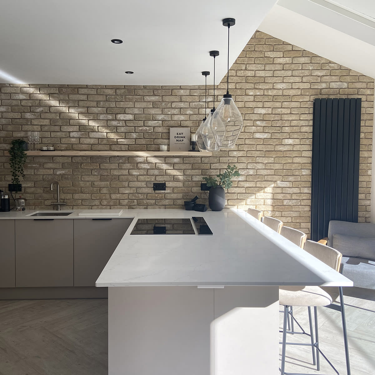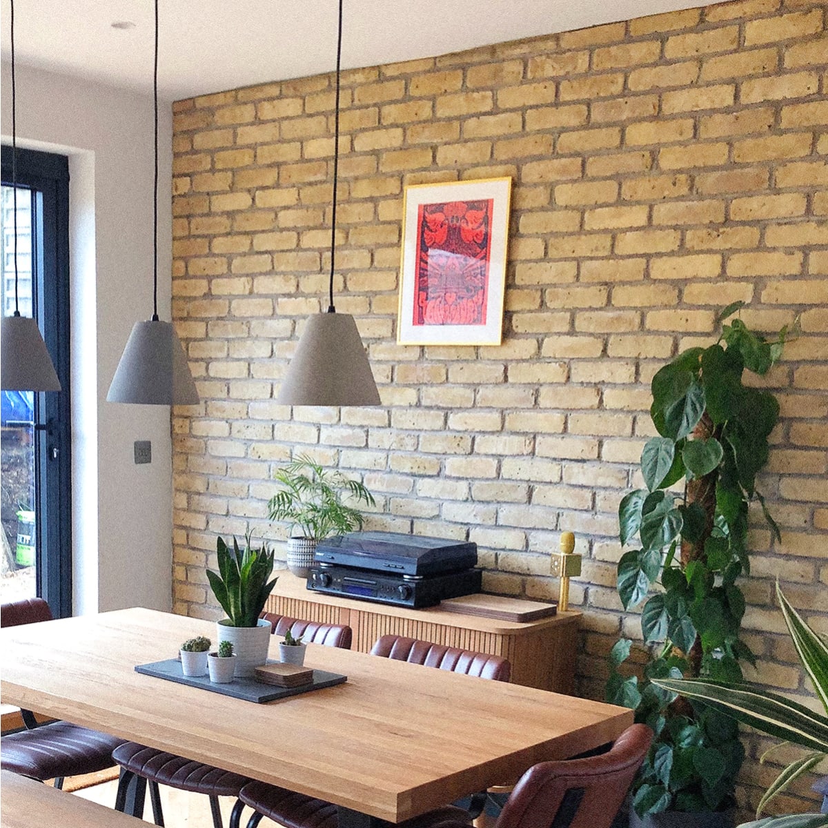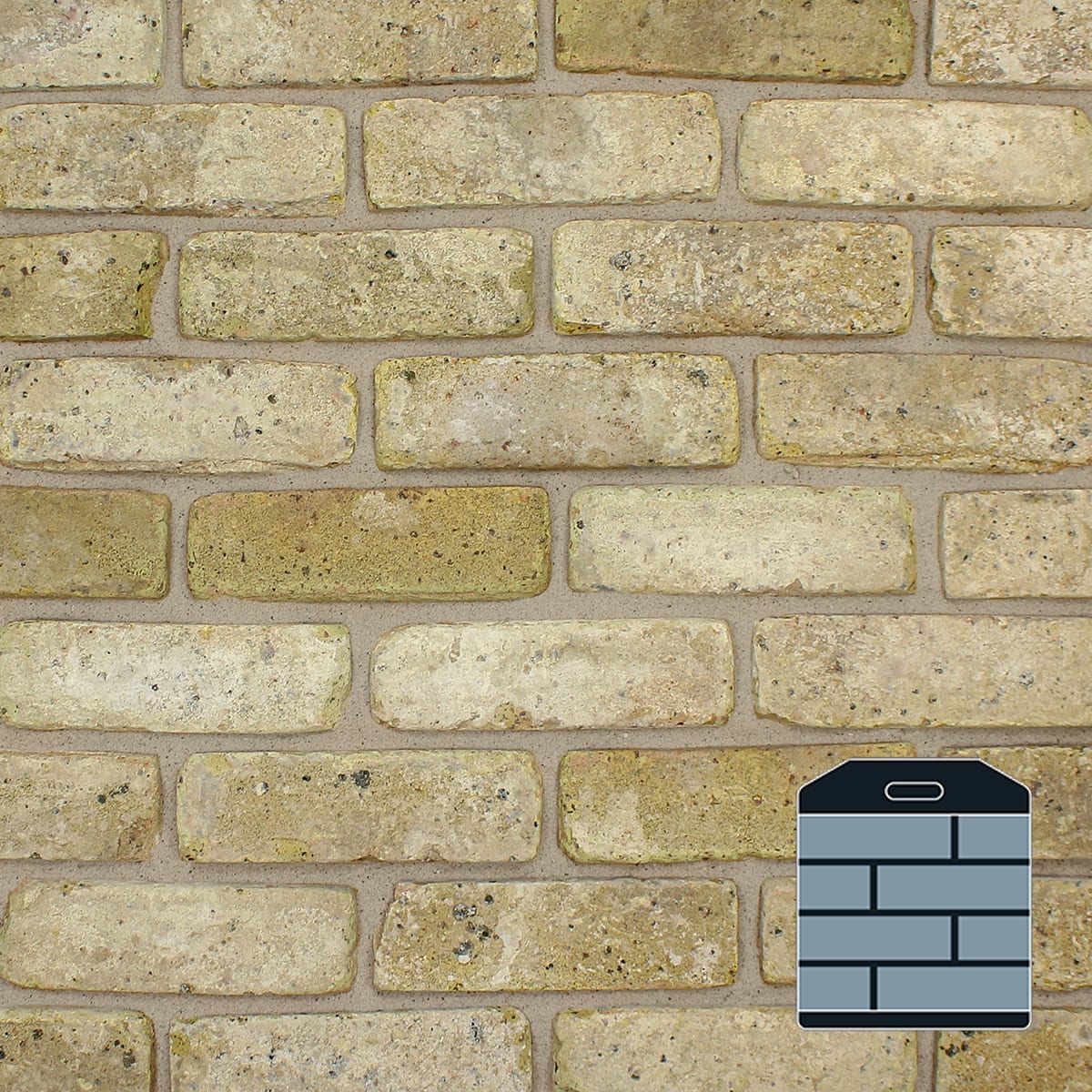 Blend 2 is a classic cream based brick slip from the reclaimed collection, the blend has variations from a light cream to a light yellow brick providing subtle colour variety, it has a small amount of mottling on the faces too. It is a tumbled brick slip so has different variations in texture and even shape, to make a completely unique final look on any feature wall, kitchen backsplash or in a fireplace. The sample panel contains 4 rows of the brick slips to show the full blend variation, but please use in conjunction with project photos to determine the ratios of these variations.