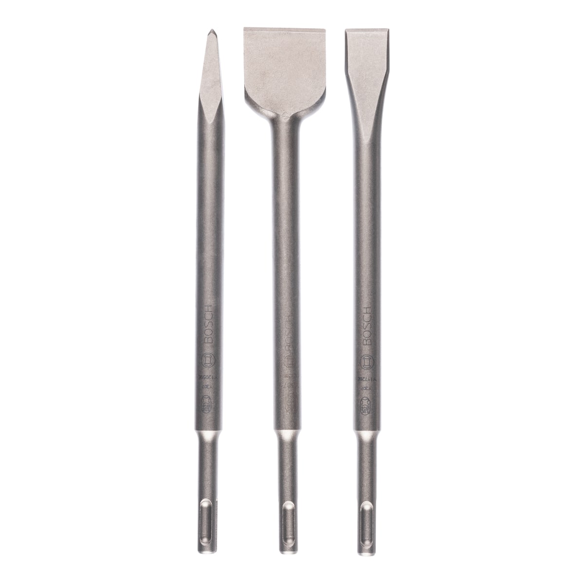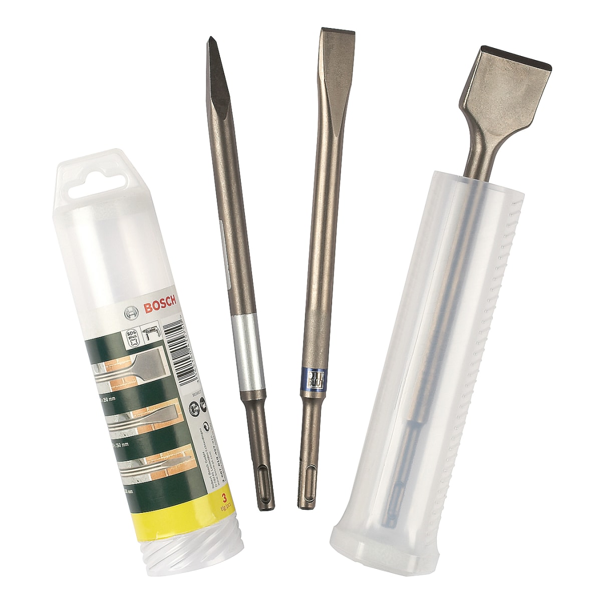 The Bosch Chisel Set SDS-Plus Carbide 3-Piece 250mm L Silver contains 1x pointed chisel, 1x flat chisel, 1x angled tile chisel also 2 layer coating insulation with different colours. This transmits the vibrations produced by the drilling machine into hard materials, thereby drilling the concrete. The product drills up to 1000 W and has a longer operational life. It is manufactured from stainless steel making it extremely hard. Each chisel has a working length up to 125mm. It has a long life with 30% longer lifetime and 15% higher material removal rate. The SDS-plus flat steel tipped drill bit tip and innovative fold for rapid drilling, dust removal and wall friction. The drilling bit has a faster drill speed in concrete, it could also be used with an impact resistant hammer for drilling bits. It is the best-suited equipment for fixing holes in natural and artificial stone, concrete, wallboard, stone, brick and slate.