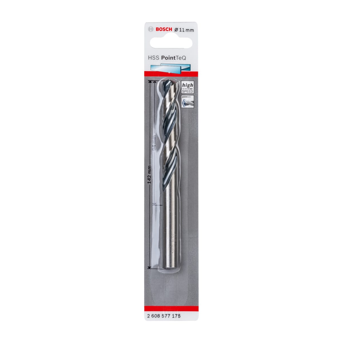 Bosch HSS PointTeQ Twist Drill Bit 142 x 11mm (L x Dia) comes with a working length of 63mm. PointTeQ tip design enables fast drilling in metal. The product conforms to DIN 338. Ergonomically designed for fast chip removal.