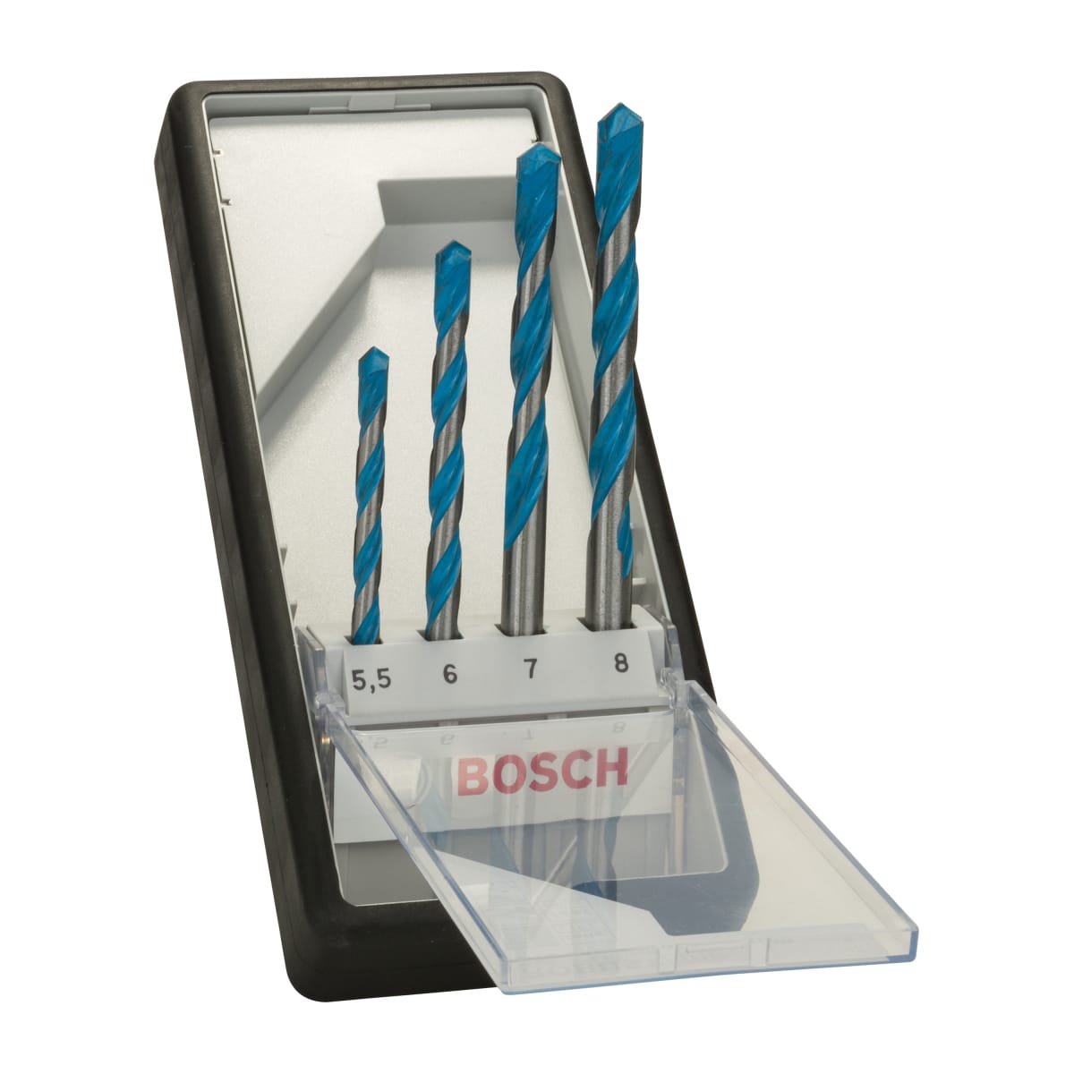 The Bosch Robust Cylinder 9 Multi-Construction Drill Bit Set Silver contains sizes 5.5mm, 6mm, 7mm and 8mm diameter bits. It transmits the vibrations produced by the drilling machine into hard materials, thereby drilling the concrete. The product drills up to 1000 W and has a longer operational life. It is manufactured from tungsten carbide making it extremely hard also the professional range of multi-purpose drill bits suitable for drilling all kinds of materials. The drilling percussion bit has a faster drill speed in concrete, it could also be used with an impact resistant hammer for drilling bits. It is the best-suited equipment for fixing holes in wood, steel, plastics, ceramics, multi-layered materials, natural stone, artificial stone, masonry and limestone.