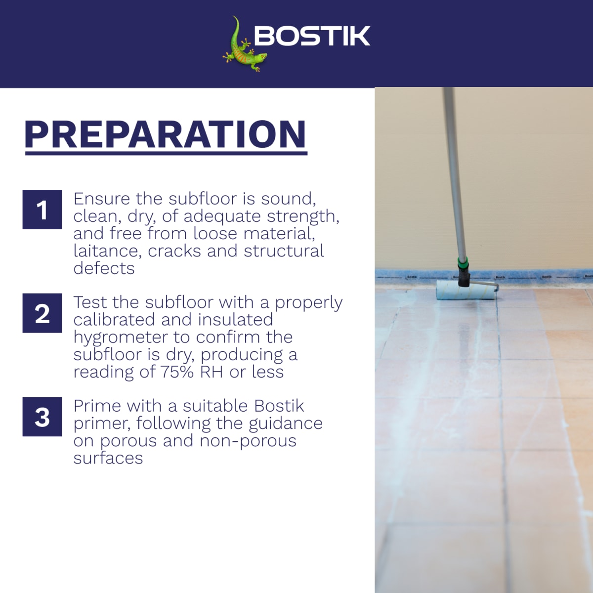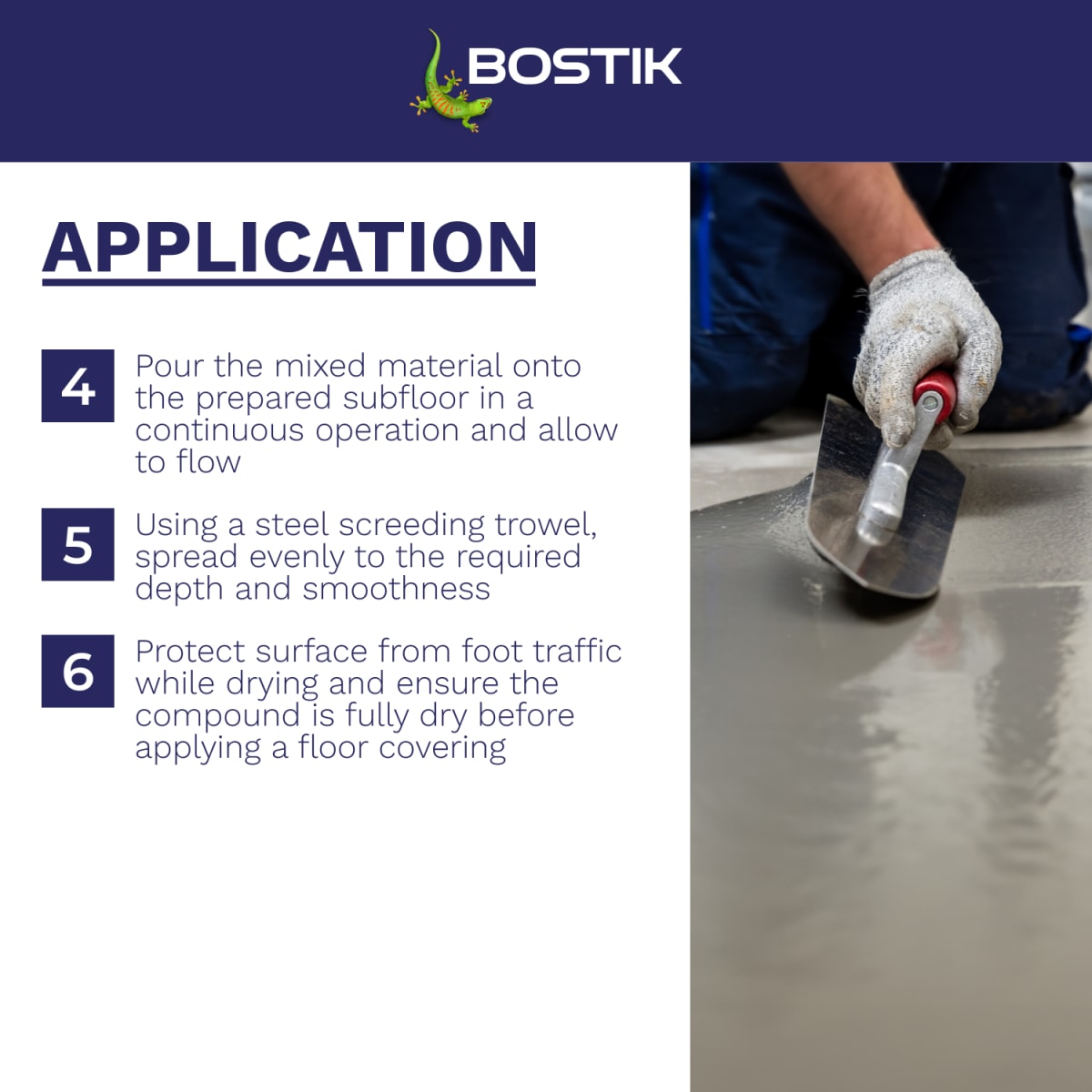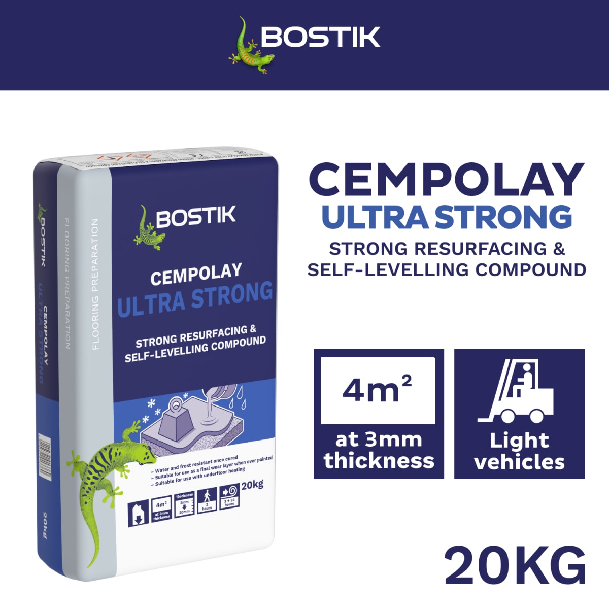 Bostik Cempolay Ultra Strong is a high strength self-levelling and resurfacing compound that's suitable for use on interior subfloors prior to laying decorative floor coverings. It's also suitable for some exterior applications prior to laying ceramic tiles, slabs and natural stone and can be used on domestic garage floors prior to over coating with a suitable floor paint. The protein-free compound can be applied between 2-20mm thickness for a maximum coverage of up to 7.5m² per unit, depending on conditions. It can be used with warm water underfloor heating systems provided a surface temperature of 27oC is not exceeded. Bostik Cempolay Ultra Strong can take foot traffic from as little as 2 hours, and is both water and frost resistant when fully cured.