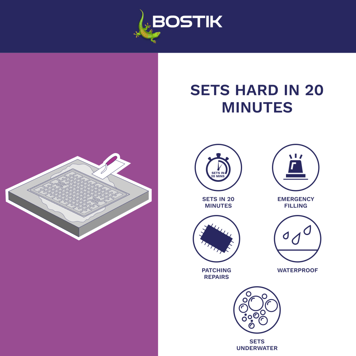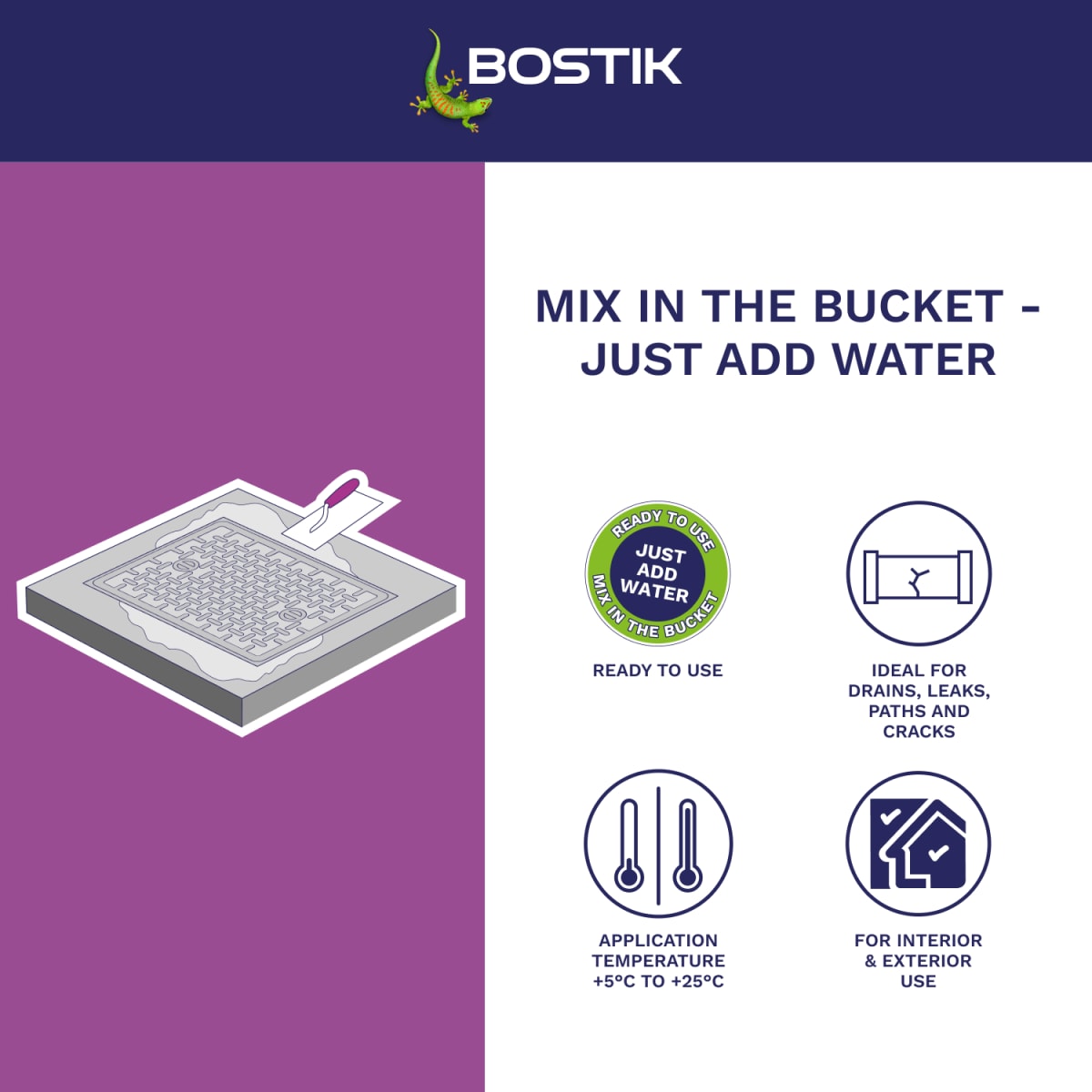 Bostik Cementone Rapid Setting Cement 10kg Grey is a water based setting mix designed for repair and maintenance projects. Ideal for filling sanitary and drainage systems, as well as maintaining concrete areas. Designed for emergency repairs as it cures underwater.