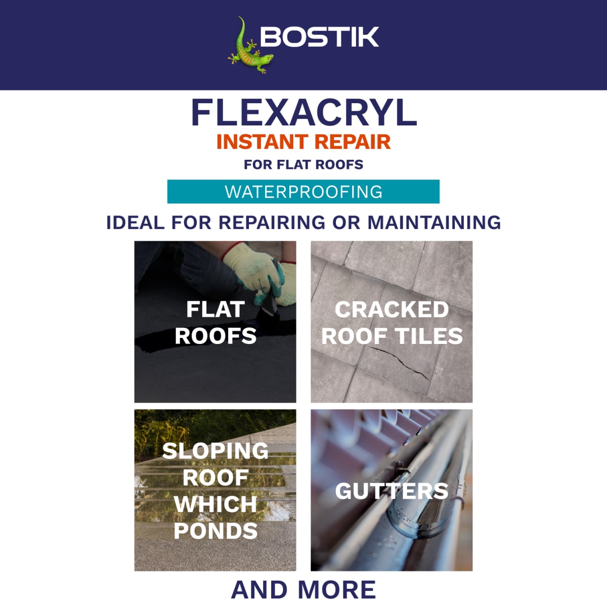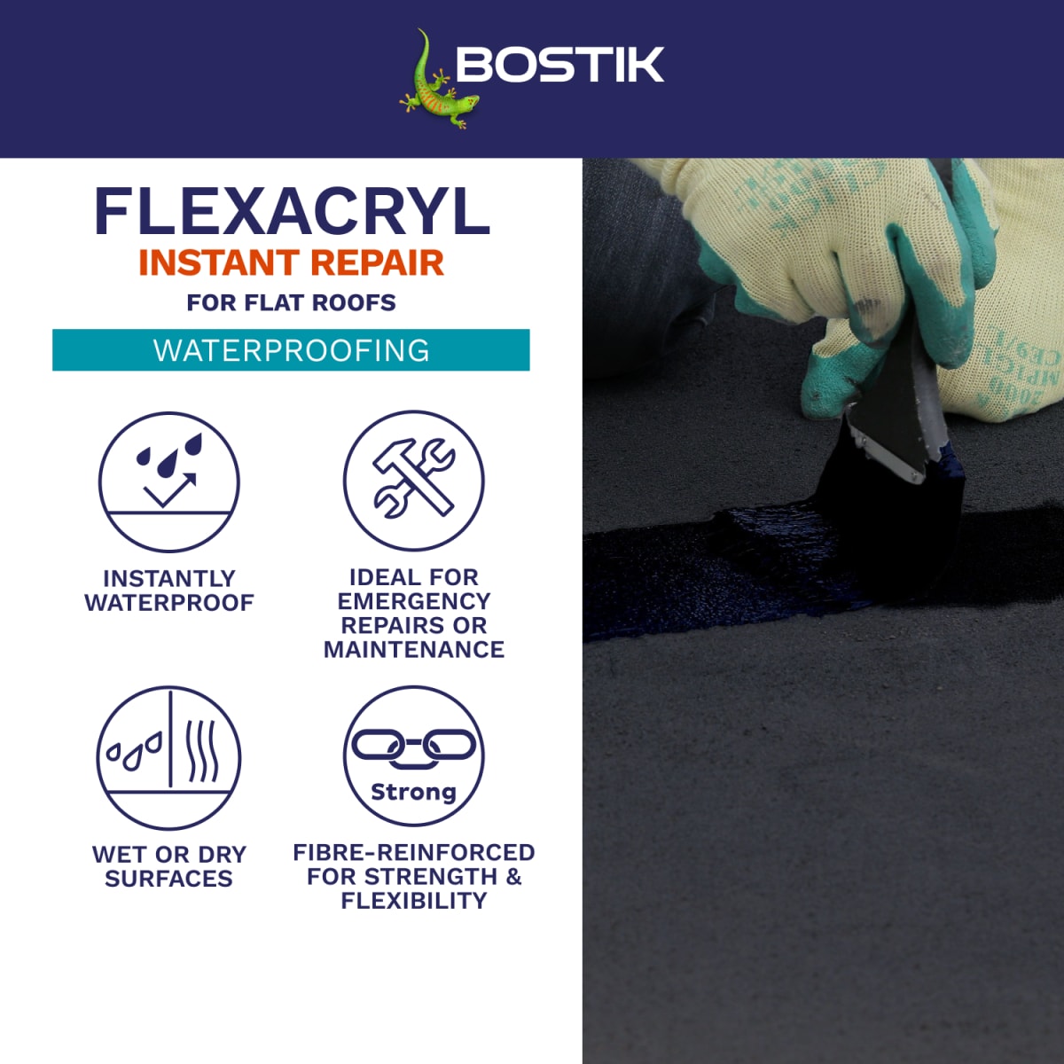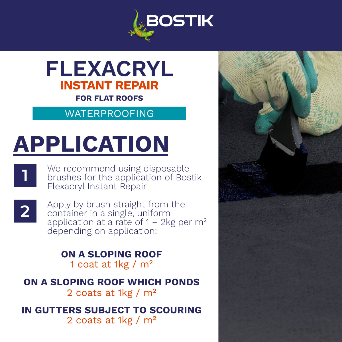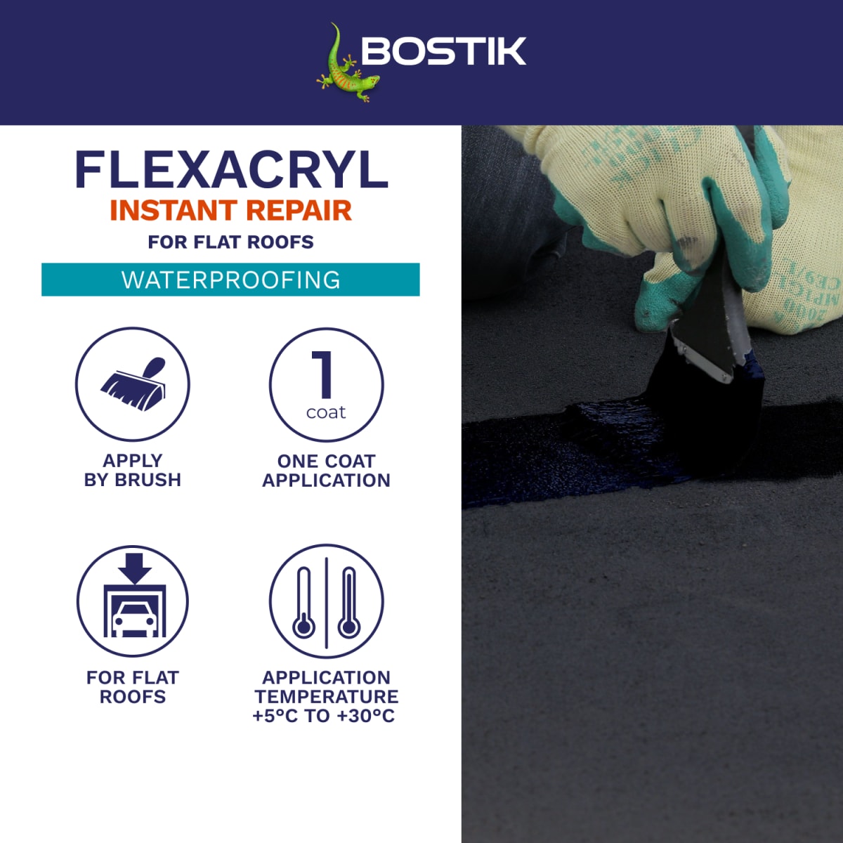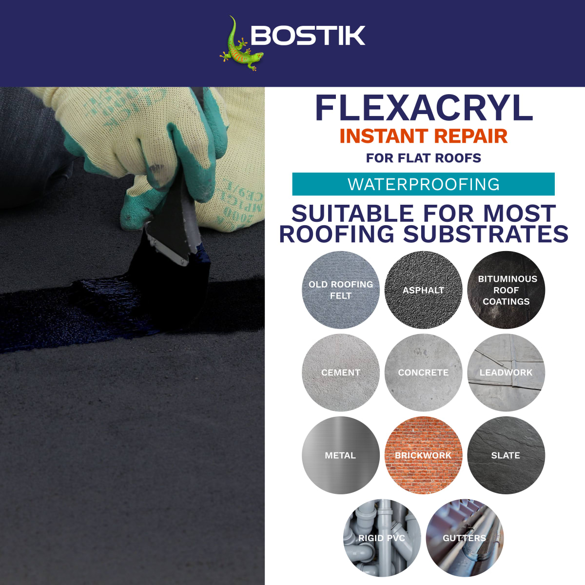 Bostik Flexacryl Instant Repair for Roofs is a flexible roof coating that offers immediate waterproofing on most conventional roof substrates. Bostik Flexacryl Instant Repair for Roofs can be brushed straight from the tin onto substrates such as old roofing felt, asphalt, bituminous roof coatings, cement, concrete, lead work, metal, brickwork, slate and rigid PVC. Bostik Flexacryl Instant Repairs for Roofs is also suitable for application to gutters and flashings. If using Bostik Flexacryl Instant Repair for Roofs on a roof or balcony subject to heavy traffic, regular use or the placing of objects such as garden furniture,
