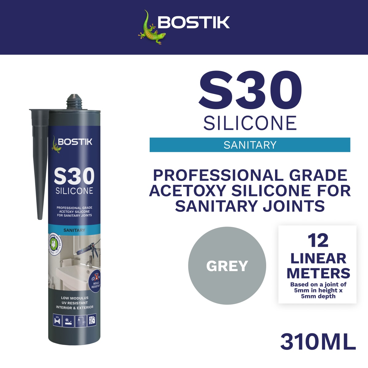 | Product Name | Bostik S30 Acetoxy Sanitary Silicone Sealant 310ml Grey |