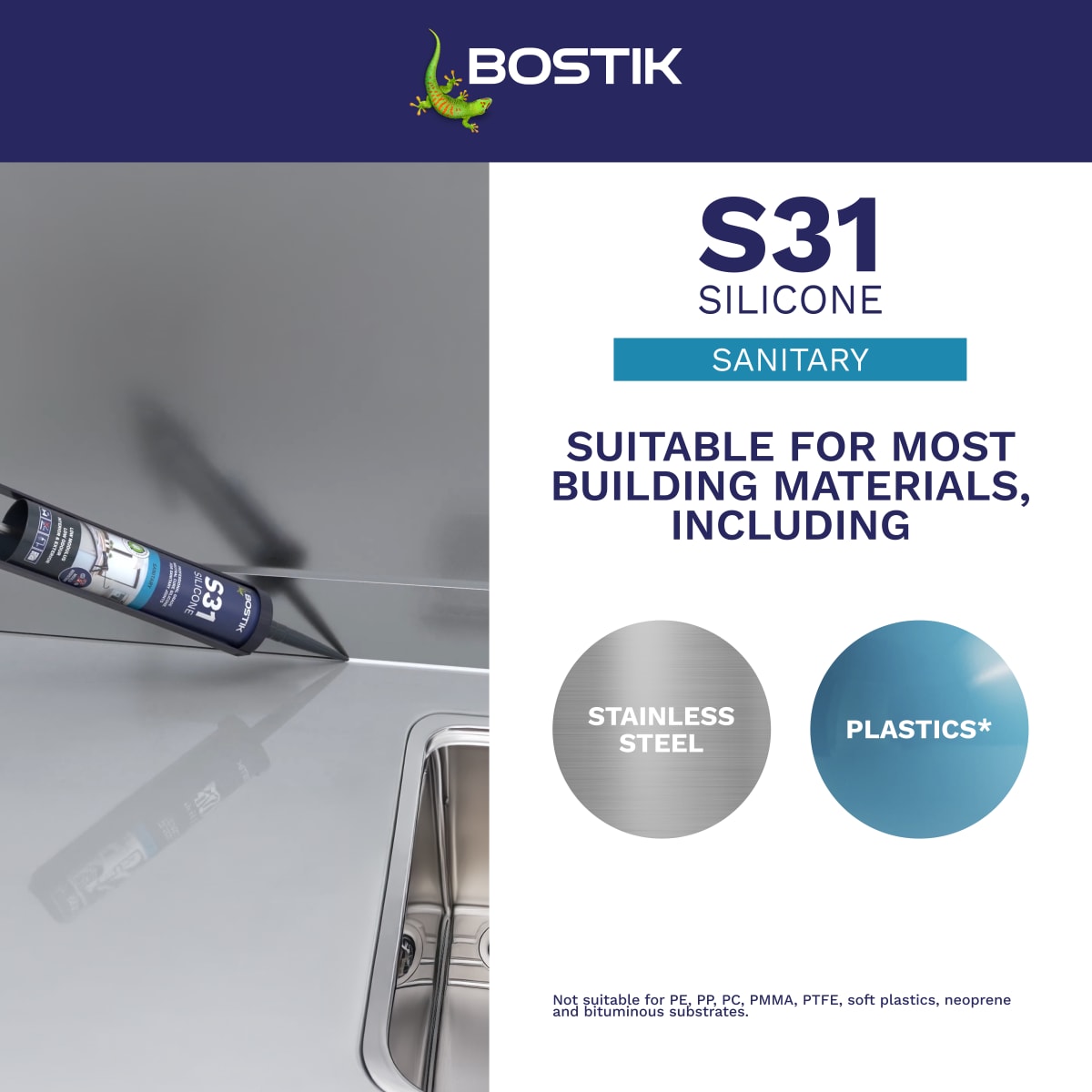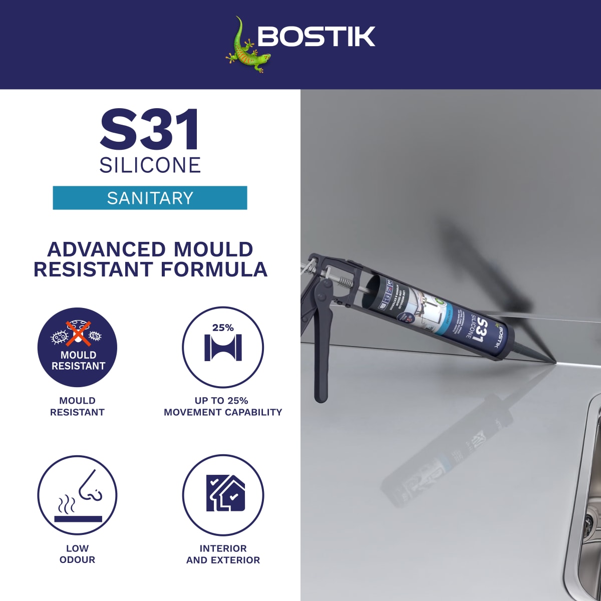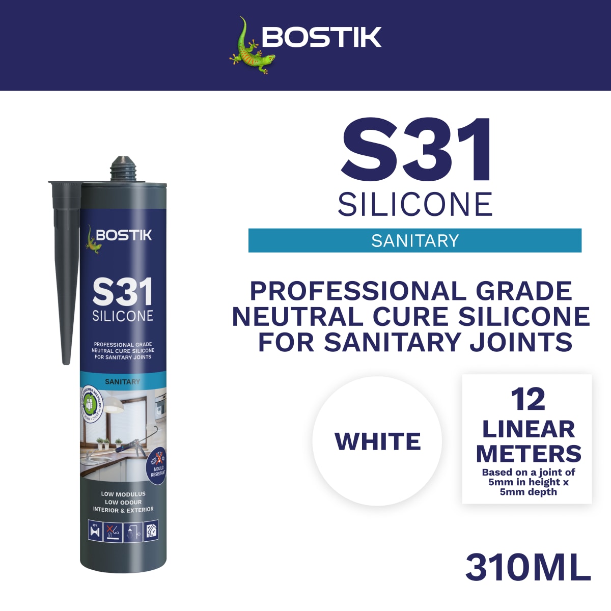 Bostik S31 Neutral Cure Sanitary Silicone Sealant is a professional grade, neutral cure silicone sealant developed for sealing sanitary joints.