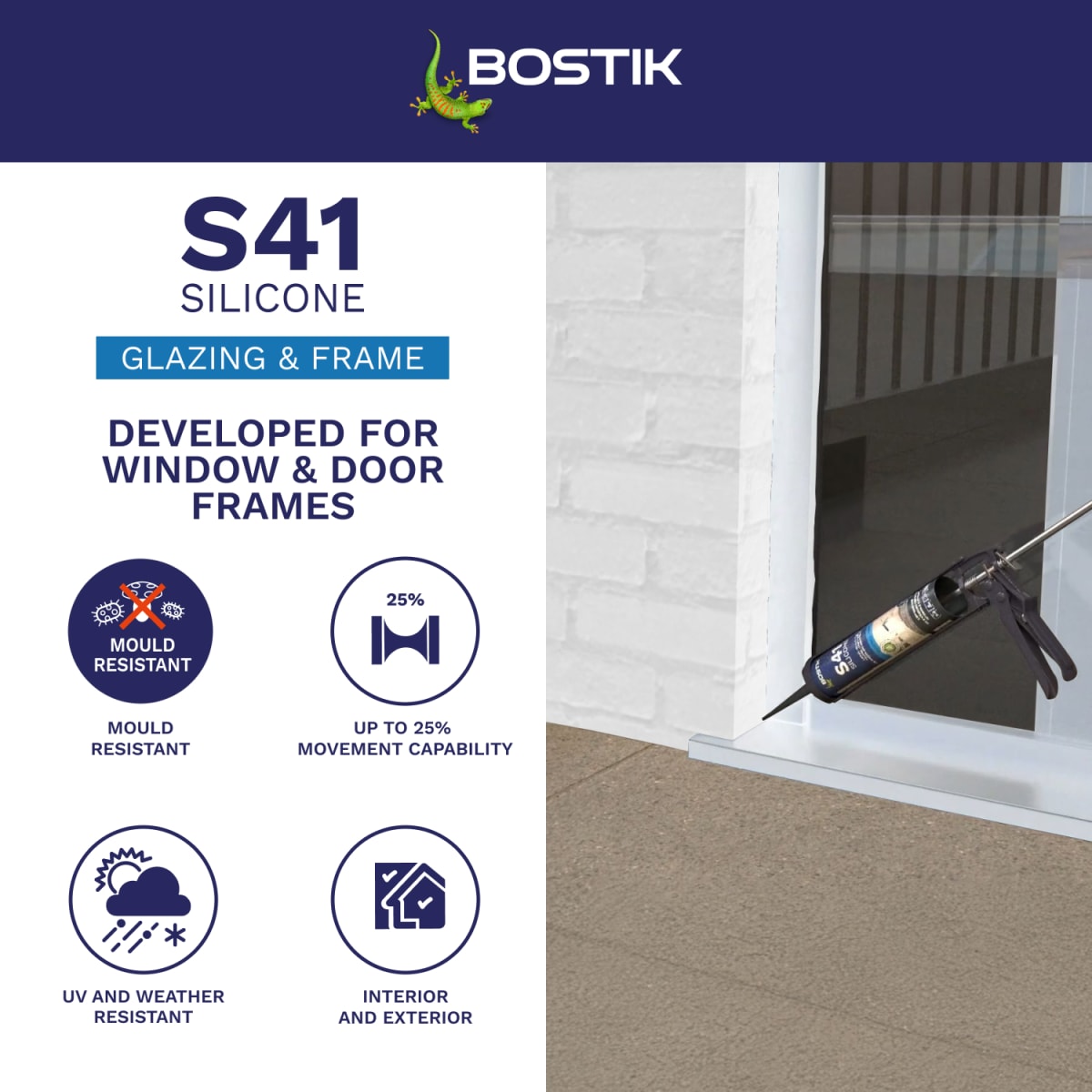 Bostik S41 Neutral Cure Window & Door Frame Silicone Sealant is a professional grade neutral cure silicone sealant, developed for sealing window and door frame joints.Suitable for interior and exterior applications, this white window and door frame sealant is low modulus and offers up to 25% movement capability. It's GEV EMICODE EC1 PLUS certified for very low emissions, is UV and weather resistant, and is supplied in a post-consumer recycled (PCR) cartridge.