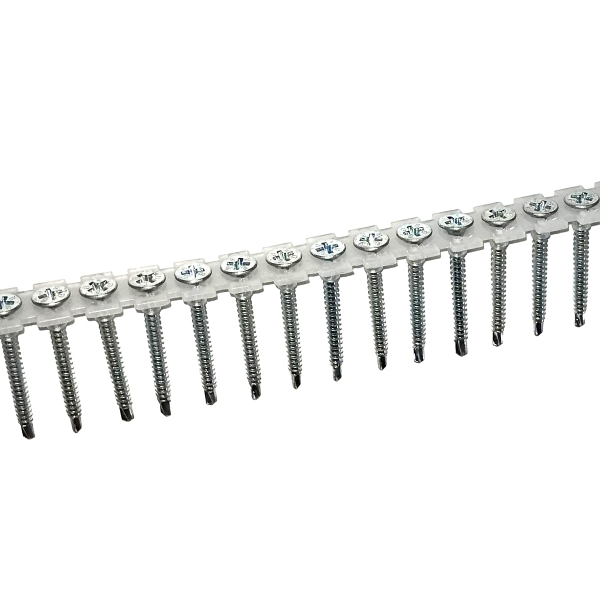 British Gypsum Collated Drywall Screws 25mm (L), Box of 1000 screws, 20 strips. Strips of 50 collated drywall screws. Designed for fixing plasterboard to Gypframe ‘C’ Studs (and associated framing) less than 0.8mm thick, Gypframe ‘I’ Stud framing less than 0.6mm thick and board to timber supports. Conforms to EN 14566.