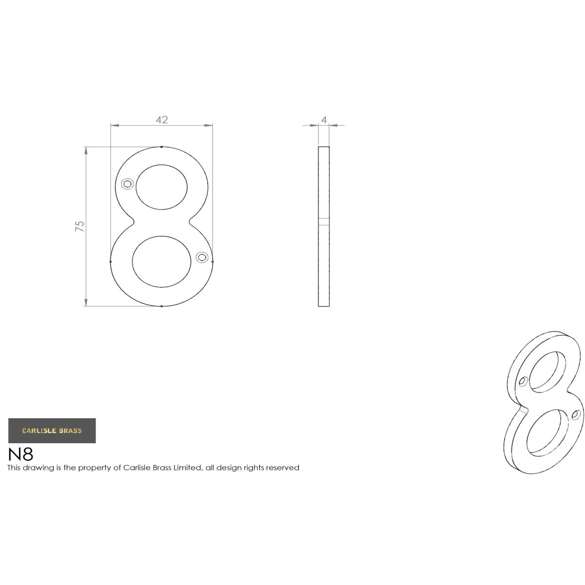 Carlisle Brass Numeral '8' Face Fix Number 75 x 42 x 4mm (L x W x T) Polished Chrome is an external door numeral. The face fix number is used to notify what post number the house is. The round ended type face provides clarity at a distance.