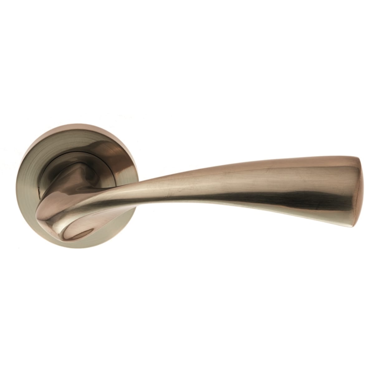 The Sintra Designer lever latch handle pack includes a pair of Sintra lever handles, a pair of ball bearing butt hinges and a bolt through tubular mortice latch. The Sintra design is a curved lever on a round rose. Finish Satin Nickel.