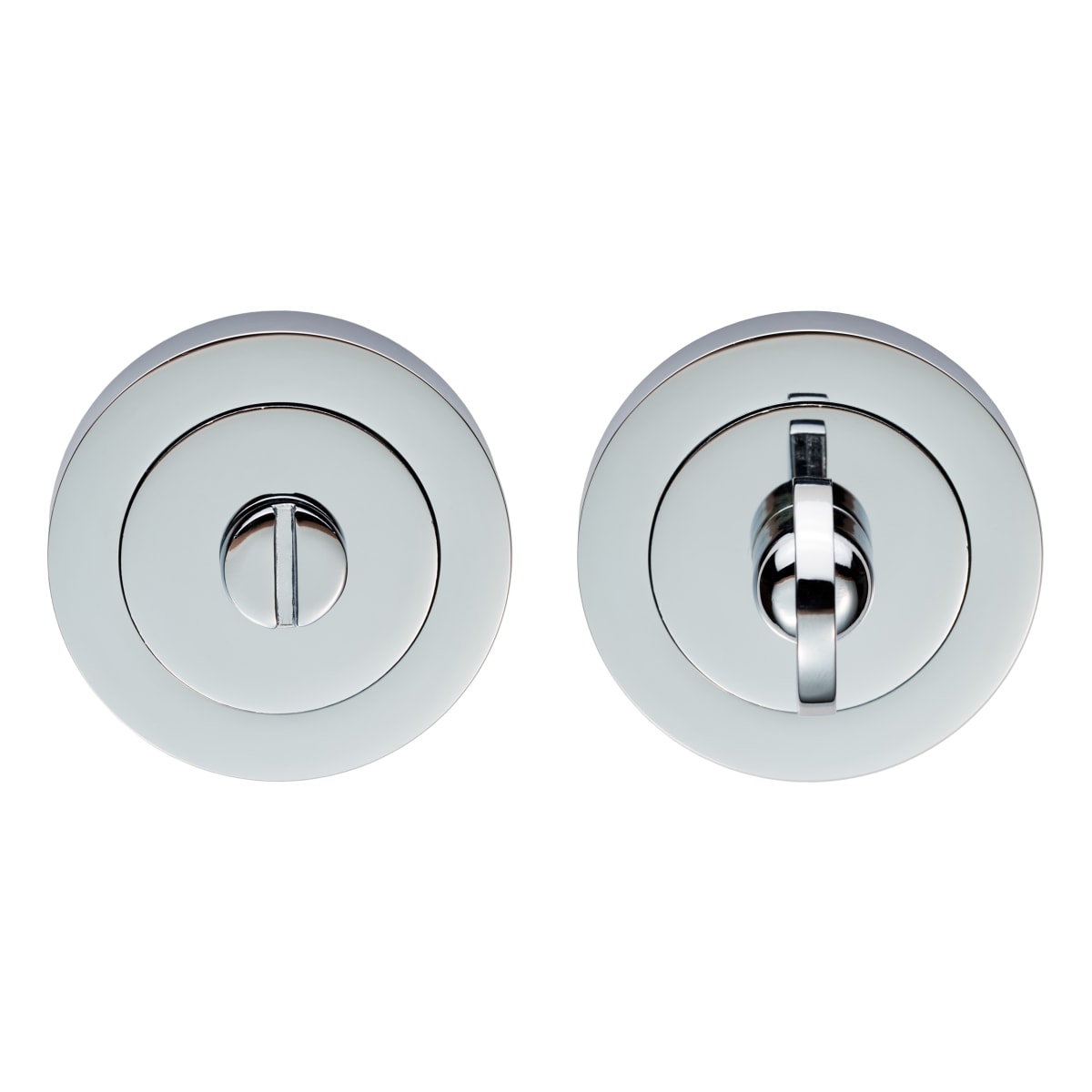 Carlisle Brass Concealed Fix Thumb Turn and Release Polished Chrome operates with a thumbturn and release action. The spindle size is 5mm and the lock is ideal for public or office toilet doors. The turn has long tubular bar on one side and the vacant or engaged indicator on the other release side.