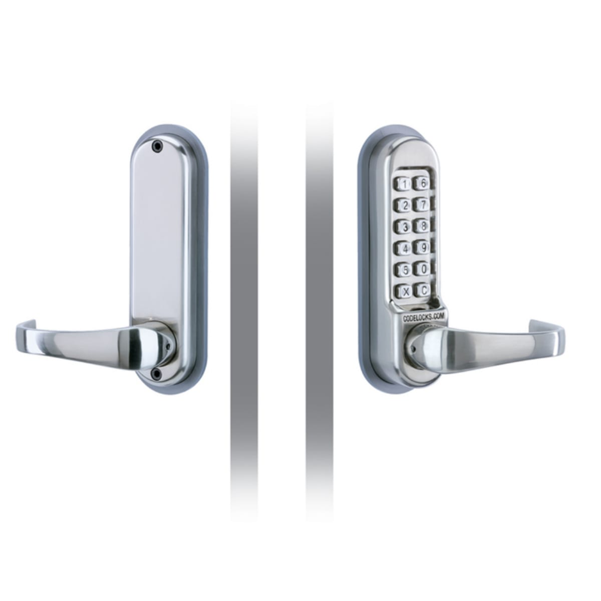 Codelocks CL500SS Heavy Duty Mechanical Keypad Front and Back Plates Stainless Steel is used with an existing mortice latch or lock with a fixing hole 22mm below the follower, or two horizontal holes at 38mm centres. Full size lever handle in stainless steel PVD finish, and suitable for use on both internal and external doors when used as the primary lock. Suitable for use on 30min and 60min doors when fitted with an aditional fire kit pack, and tested in accordance to BSEN1634-1 2008. For use in heavy duty environments including commercial buildings, hospitals, care homes, schools, hotels and leisure centres.