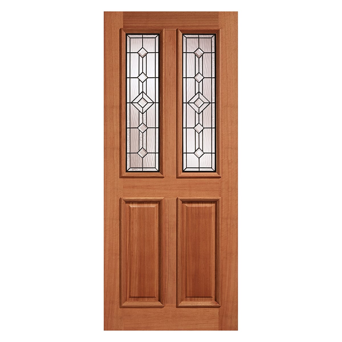 Two decorative lead double glazed panels are fitted in this hardwood Derby door, with raised moulding on one side and a M&T construction.