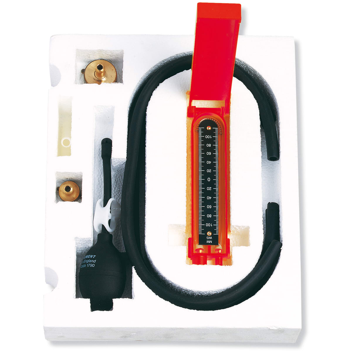 Kit containing all components required for completing a drain test. Comprises: 100mm (4”) U-gauge, hand bellows, Y-piece connector, manometer tubing, 25mm (1”) and 12.5mm (½”) brass nipples.