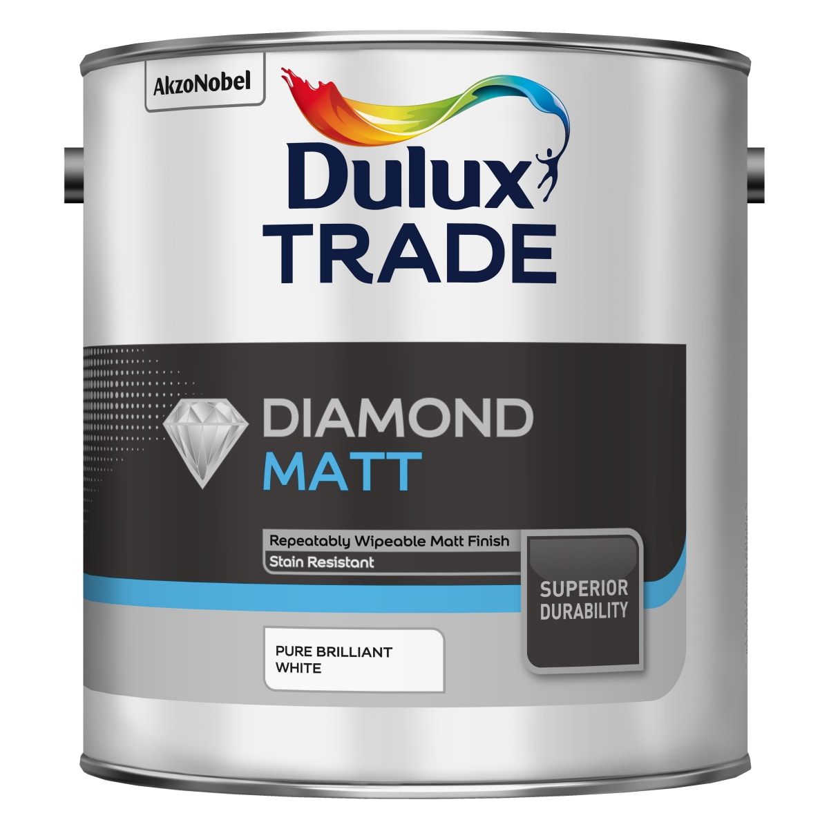 Dulux Trade Diamond Matt is a tough, water-based matt emulsion paint that uses Diamond Technology from Dulux Trade, making it 10 times tougher than Dulux Trade Vinyl Silk and Dulux Trade Vinyl Matt. Ideal for high traffic areas such as stairwells and hallways, it is resistant to typical household stains and will repeatedly wipe clean without polishing up.