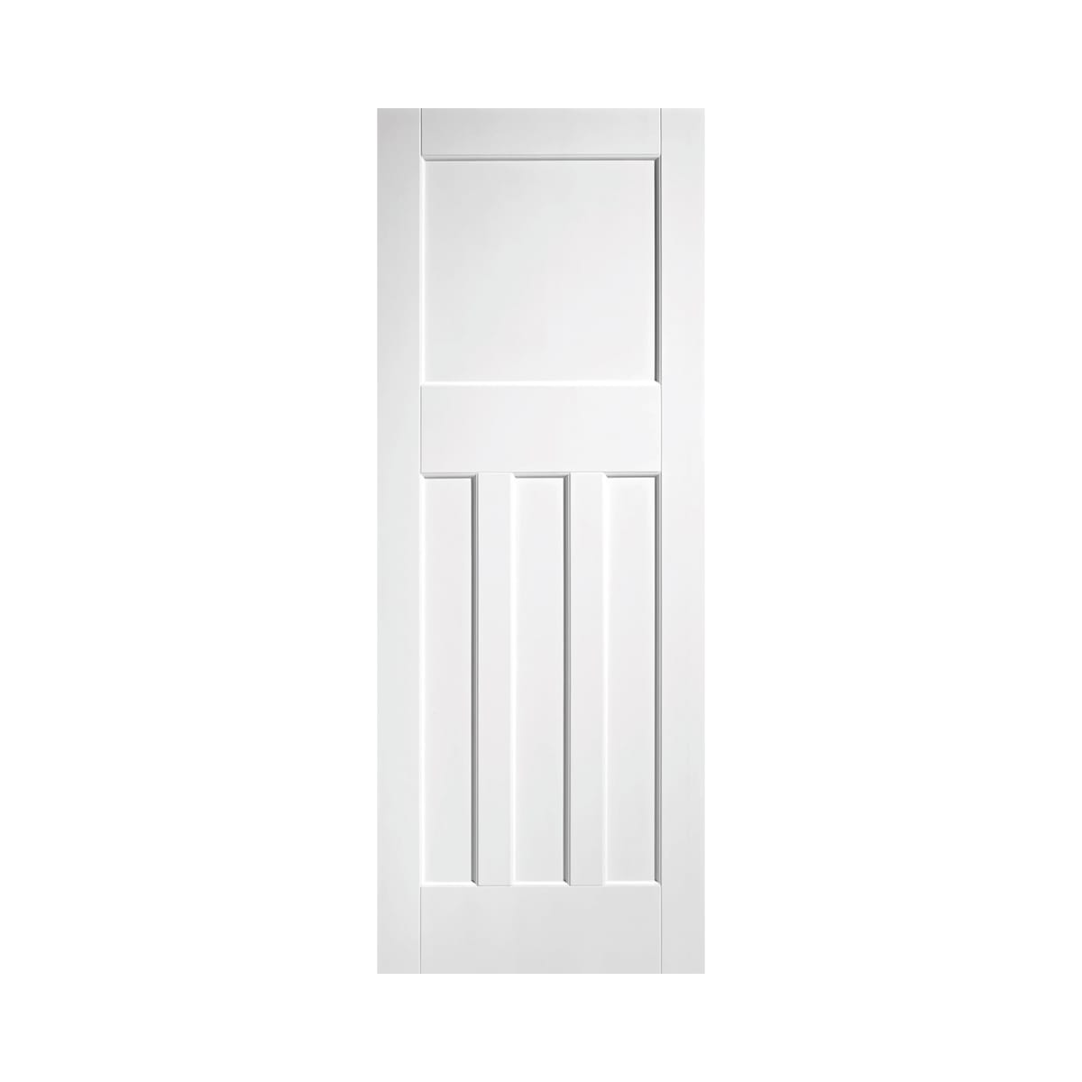 This 30's style door is made from a primed solid core in white and features three rectangular inset panels below a larger square panel.