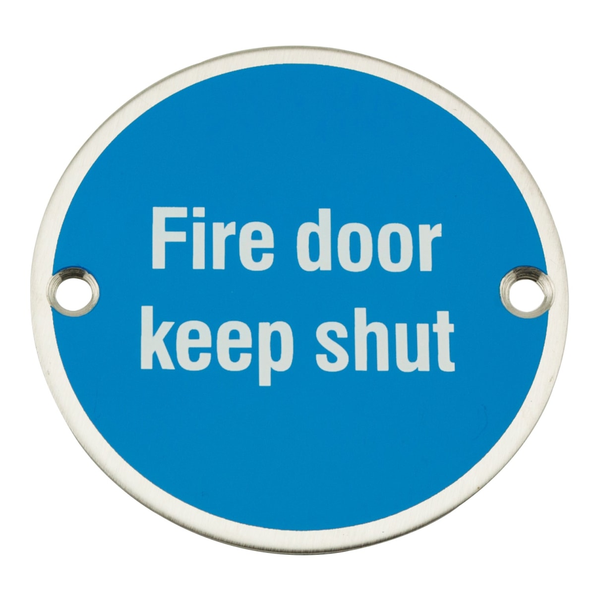 75mm Circular Satin Stainless Steel Fire Door Keep Shut symbol. EN1634 FD 30,60 and 240 minutes fire rated. Supplied with Fixings