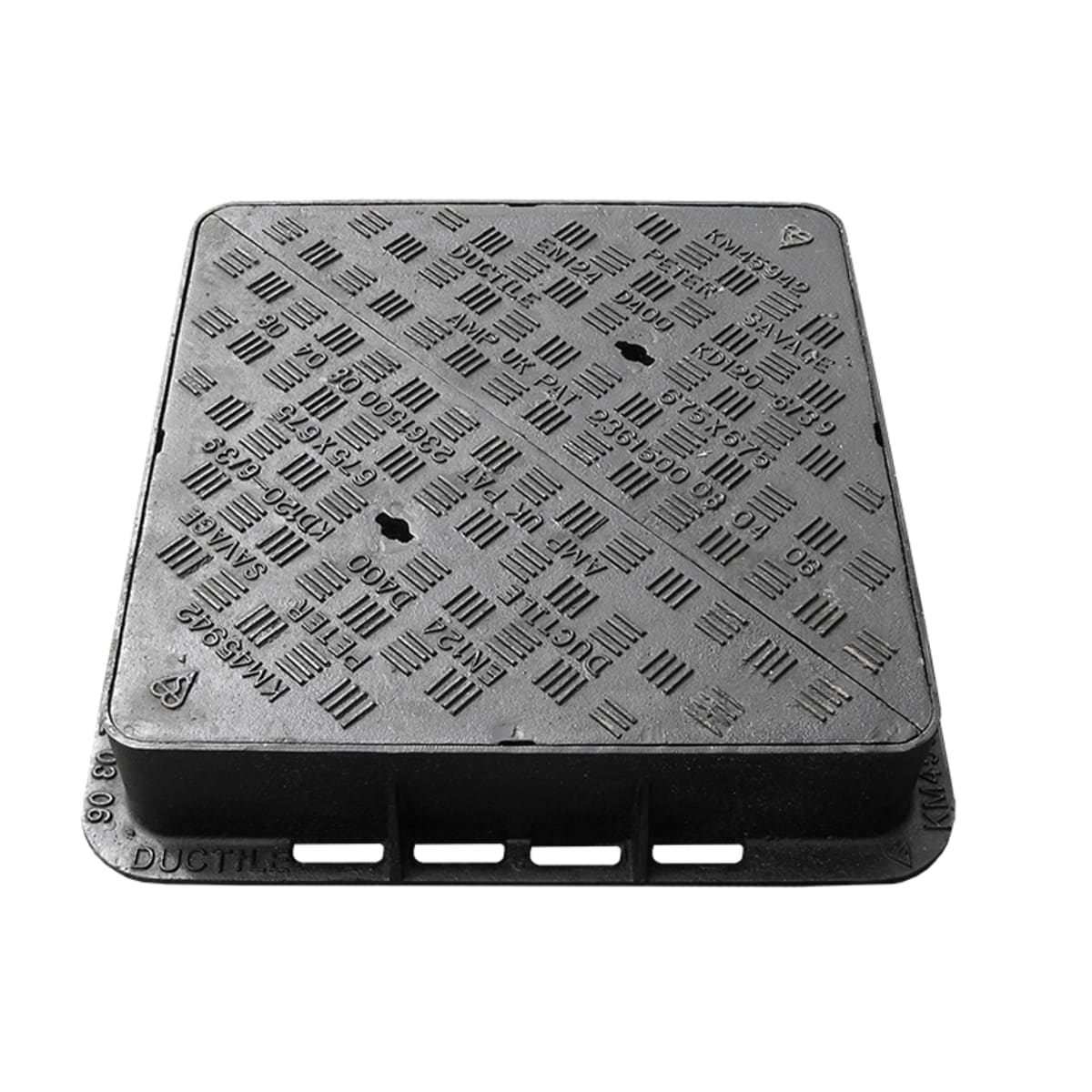 The EJ Manhole Cover Frame Ductile Iron DT KMD D400 675 x 675 x 100mm is constructed from quality ductile iron material for its extra tough and durability making it ideal for withstanding in any condition. It measures 675 x 675 x 100mm (L x W x D) with the weight of 81kg which offers maximum adjustability in handling for user requirements. It is available in black colour with a polished finish. It is manufactured to BS EN124 Class D400 which has 40-tonne safe test load. The anti-movement technology for improved bonding to bedding material. The non-rock three point suspension for added stability and silent operation. The ductile iron for strength ratio in its durability, long lasting, eco-friendly and 100% recyclable which is quick and easy in installation.