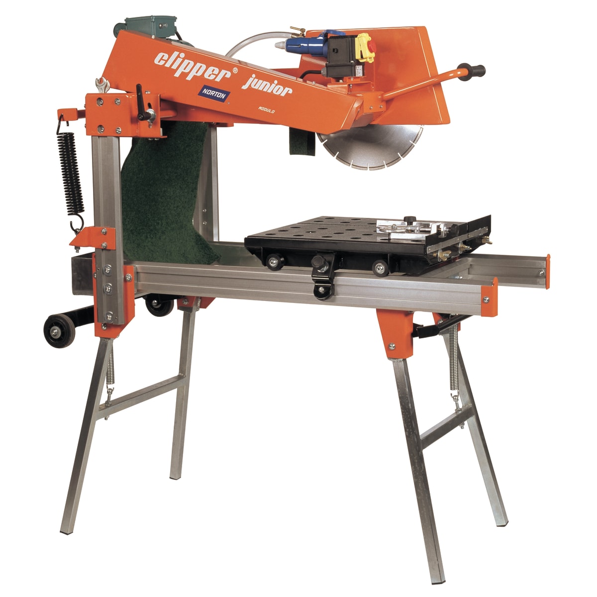 Compact portable masonry saw with adjustable, removable legs, tilting table and independent water pump. Used for cutting small and large tiles and slabs, bricks and blocks and small building materials.