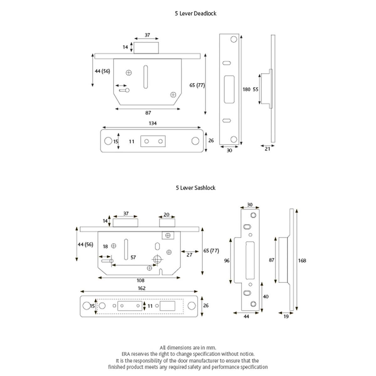 ERA Viscount 5 Lever Deadlock 65mm. 5 Lever deadlock for additional security. Perfect for replacement and new built projects, Easily reversible bolt for both left or right hand opening doors, Offers long service in demanding situations and is designed to resist hacksawing as well as lock picking. When locked / deadlock mode can only be unlocked with a key, Levers designed with false notching to resist lock picking, Supplied with two steel keys with more than 1000 variations, Perfect for replacing existing 2 and 3 Lever locks, meets the requirements of UKCA for fire does when used with appropriate intumescent lock kits.