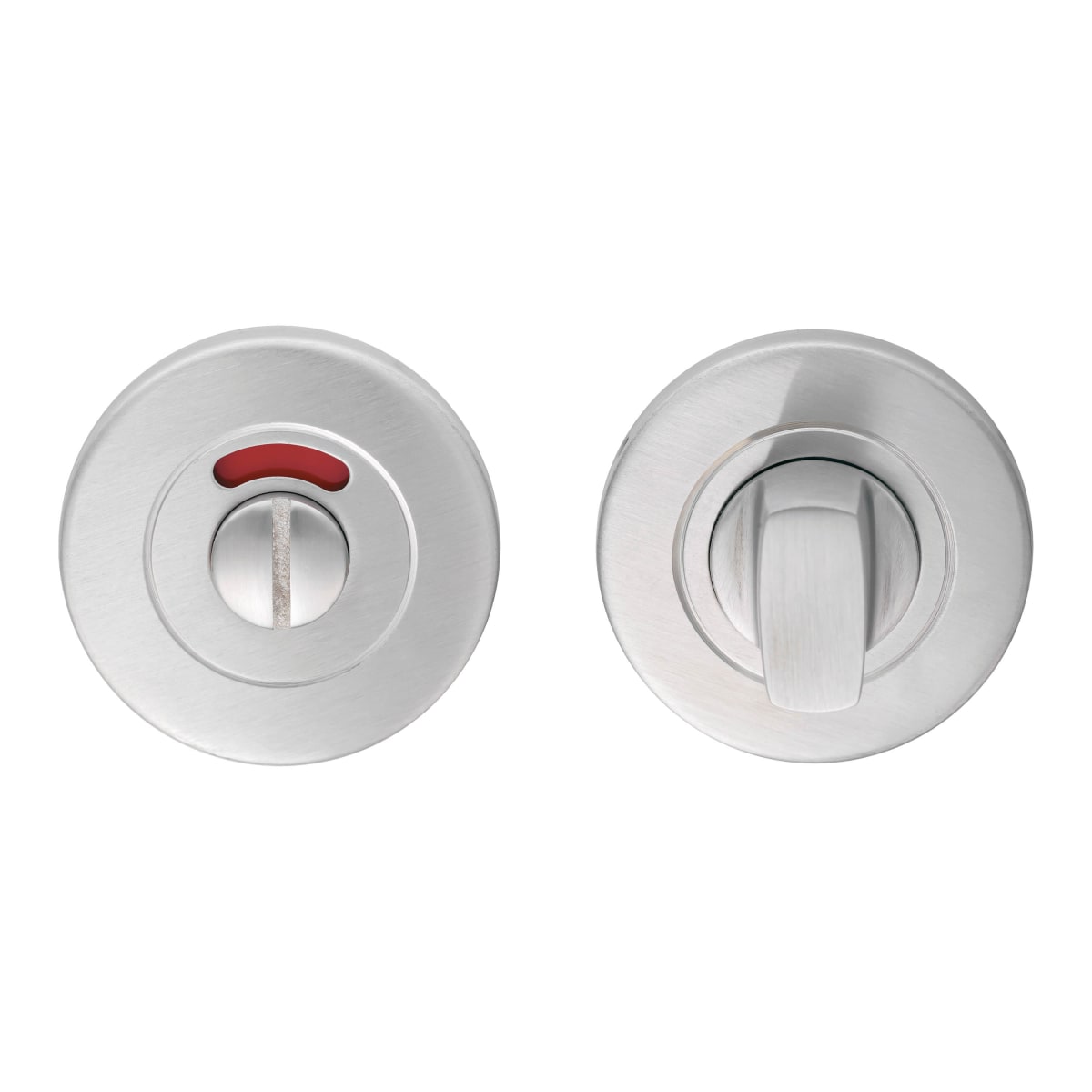 Eurospec Thumbturn and Release Satin Stainless Steel set operates with a thumbturn/release action, ideal for public or office toilet doors. Made from stainless steel, the rose measures in 52mm diameter with the thicknesses of 8mm. Thumbturn is fixed to the inside of the door with an outside emergency coin release having a vacant/engaged indicator.