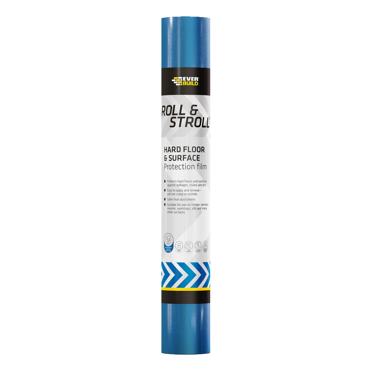 Everbuild Roll & Stroll Hard Surface Protector is the ultimate self adhesive Hard Surface Protector, ideal for protecting against mess, dirt, staining, spillages and soiling that occurs during painting, plastering, building, tiling, general maintenance and repair work. Roll and Stroll is ideal for protecting most hard surfaces including timber, ceramic tiles, laminate, vinyl, metal and stone. Roll and Stroll can also be used to protect worktops, window sills, doors, kitchen units and glass. Totally waterproof, Roll and Stroll protects against expensive to clean paint spillages on hard surfaces. Due to the adhesive face being reverse wound, Roll and Stroll easily unwinds with minimum effort and no need to bend down.