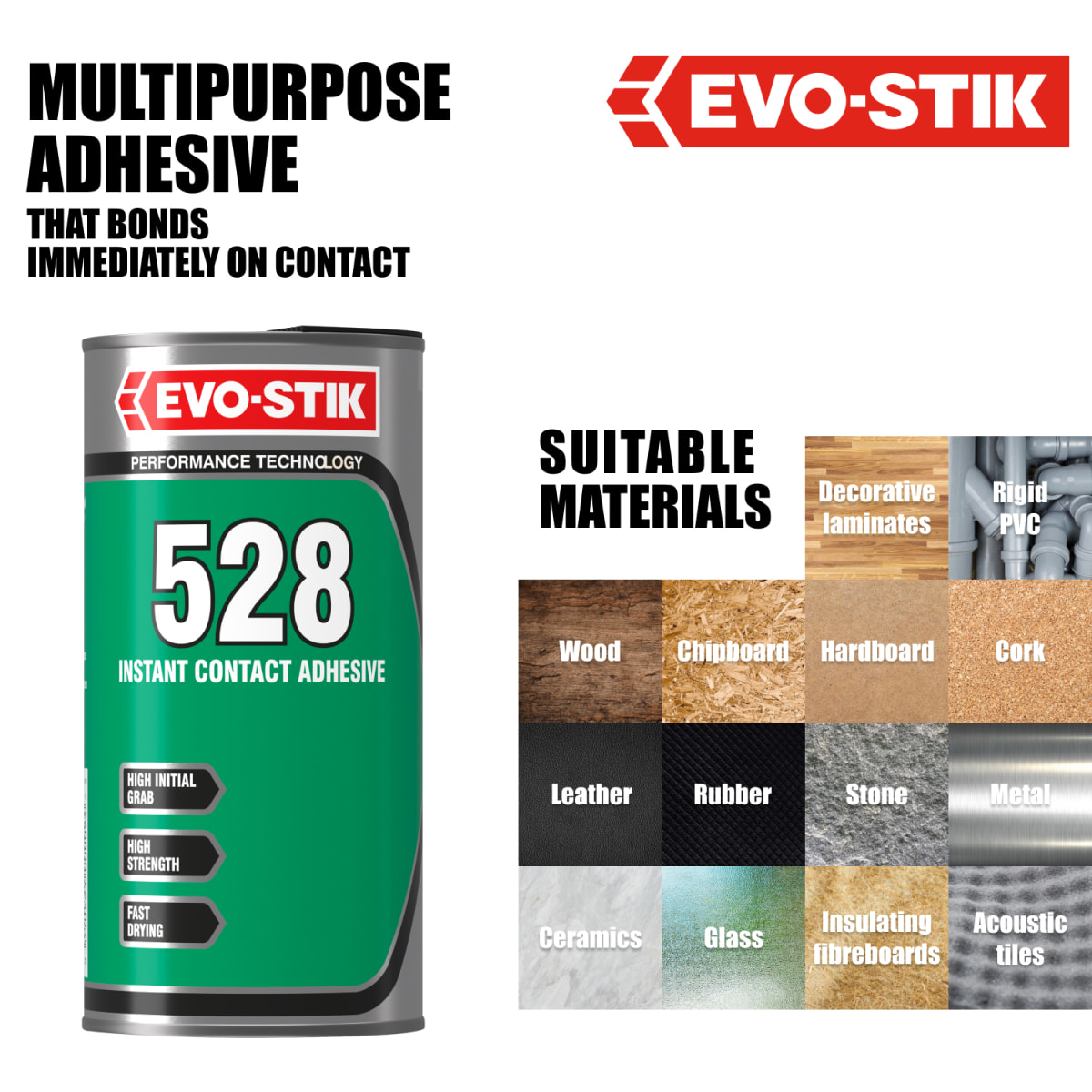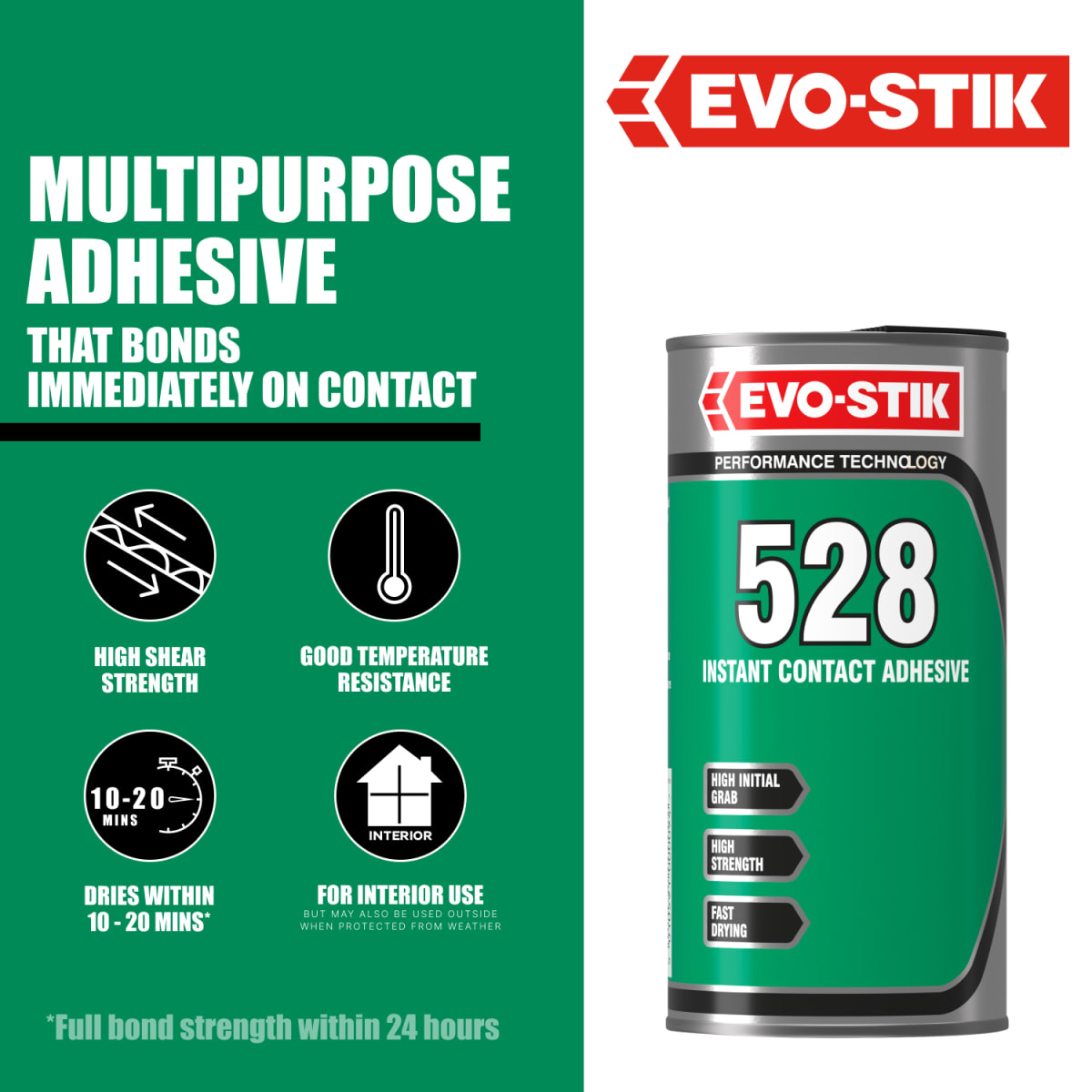 You must be 18 years old or over to buy this product.The Evo Stik 528 Contact Adhesive 1 Litre is a multi-purpose adhesive which bonds immediately on contact which offering high shear strength and good temperature resistance. This 528 Contact Adhesive is intended for interior use but also used for outside where it can be protected from the weather. Do not use Evo-Stik 528 Contact Adhesive on polystyrene or on cellulose painted surfaces.