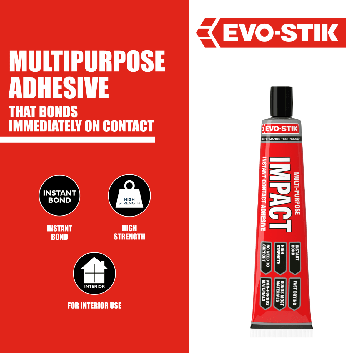 You must be 18 years old or over to buy this product.The Evo-Stik Impact Adhesive 65g Large Tube Clear colour is a high strength, multipurpose adhesive that bonds instantly on contact. The adhesive that bonds on contact that does not require the need for clamping or support. The Evo-Stik impact adhesive has the power to bond most types of materials, and will even fix non-porous surfaces together, making it ideal for a wide range of DIY tasks and household repairs. It is used in both interior and exterior applications. It is also used to bond laminated panels and acoustic tiles to suspended or vertical surfaces such as flat surfaced ceilings or walls.