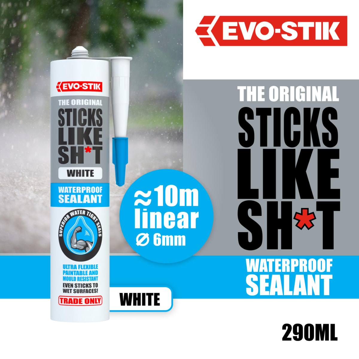 EVO-STIK Sticks Like Sh*t Waterproof Sealant is a hi-tech, no compromise, SM Polymer sealant. Ideal for use in bathrooms and kitchens, sealing around window and door frames, and for sealing roofs and guttering - it can even be applied in the rain!