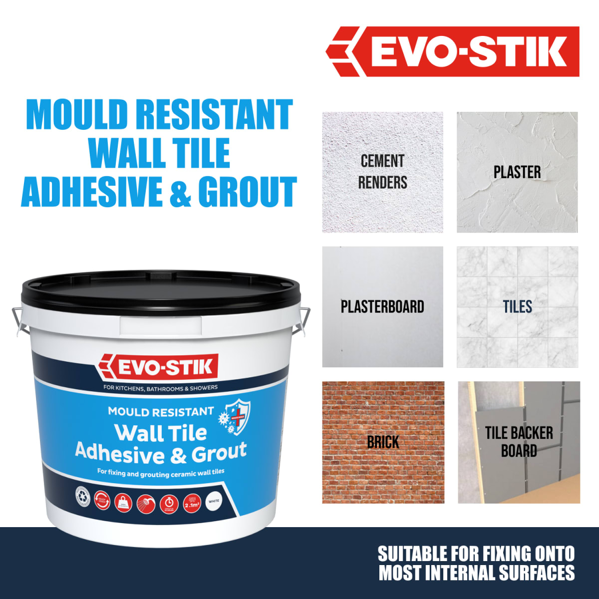 Evo-Stik Wall Tile Adhesive and Grout Mould Resistance is a ready to use ceramic and mosaic wall tile adhesive.