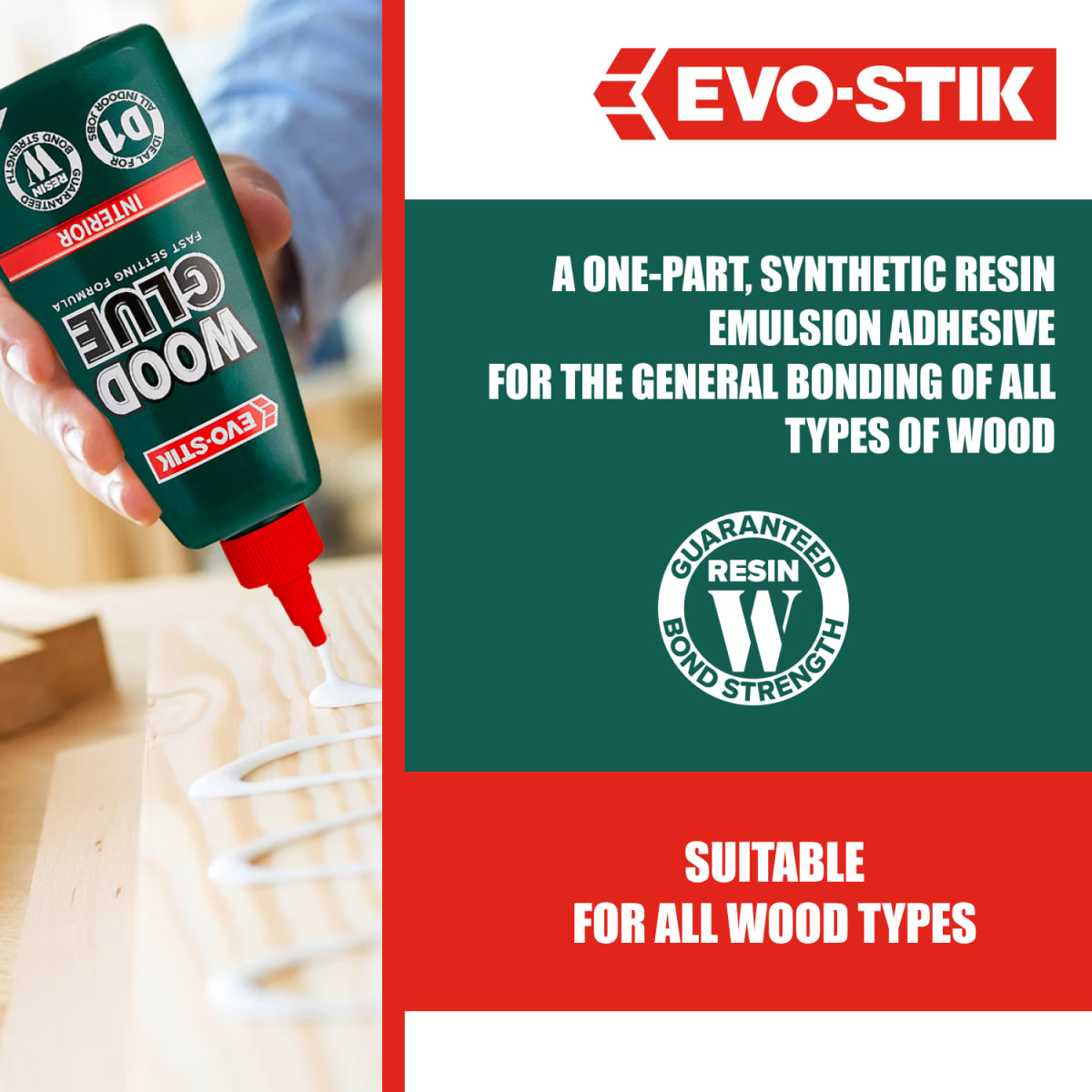 Evo-Stik Resin 'W' Interior Wood Adhesive is a one-part, fast drying adhesive for bonding of wood in non-structural applications, such as door frames, drawers etc. It is suitable for internal use and protected external use. Evo-Stik Resin 'W' Interior Wood Adhesive is non-flammable and dries translucent.