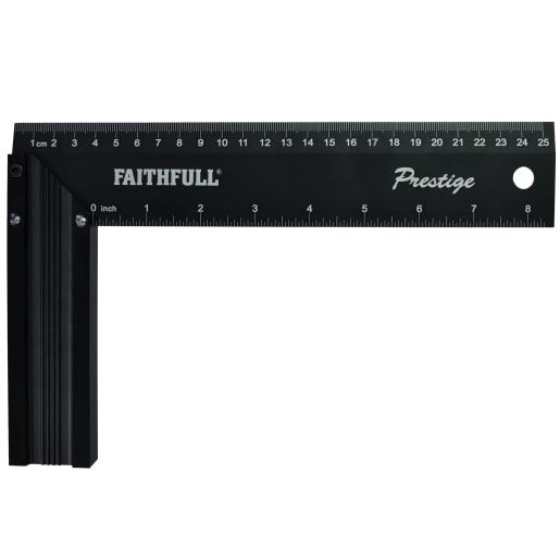The Faithfull Prestige Try Square is used for marking out 90° angles, with ruled metric and imperial markings. Manufactured from aluminium and CNC machined for high accuracy. Black anodised for corrosion and scratch protection. Laser engraved gauge for clear reading.