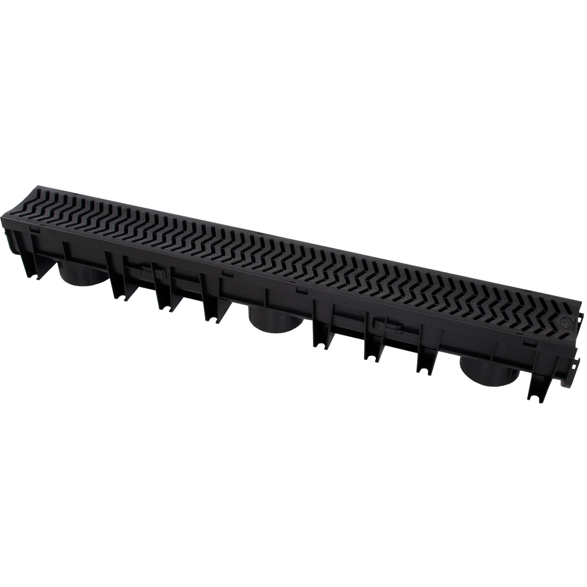 Flexseal Storm Drain Plus Channel Plastic Grate 1m L Black offers heel guard grates as standard. Features 3 vertical outlets for flexibility. The horizontal entry or outlet points can be connected to either 100mm or 110mm pipes.