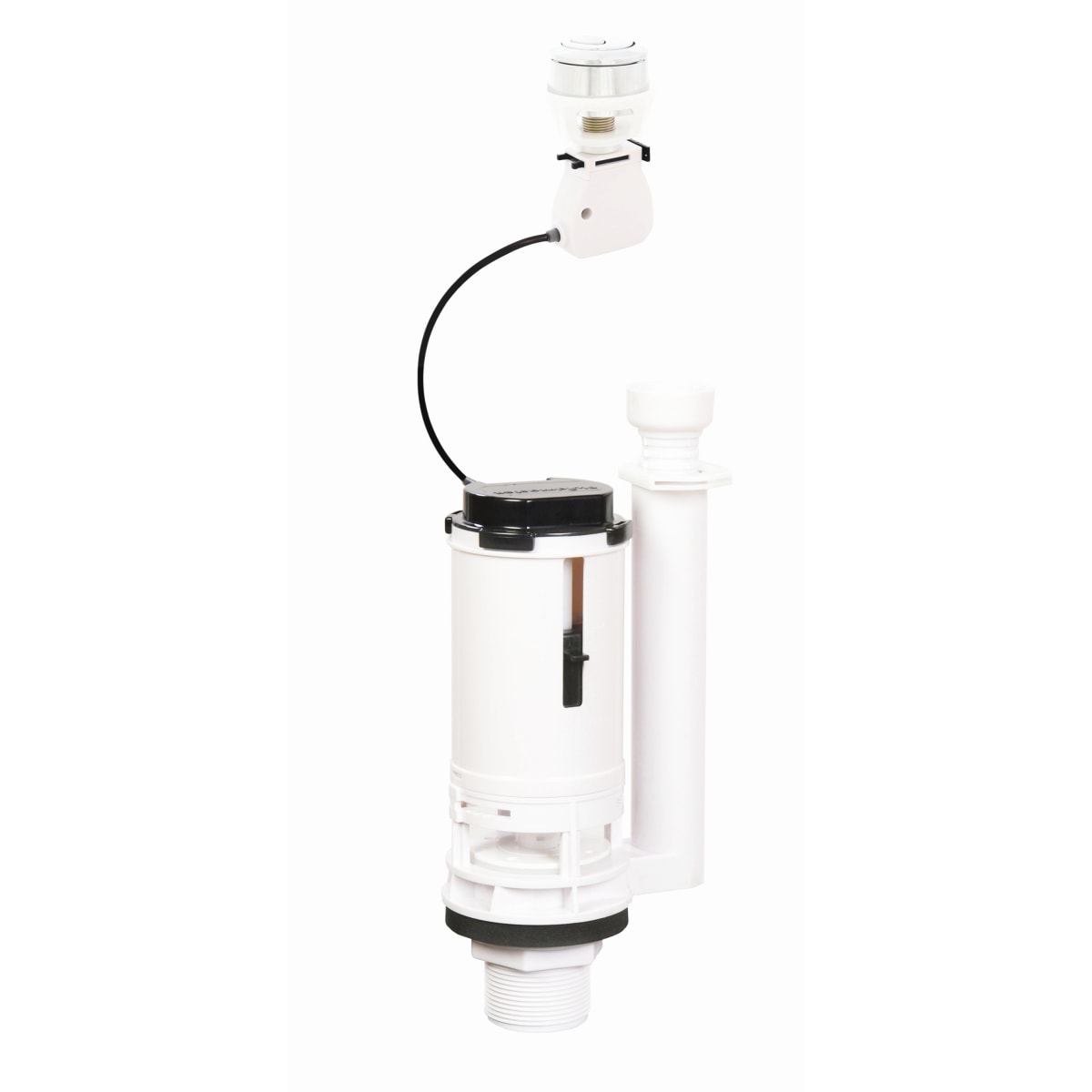 Fluidmaster Pro Button Cable Dual Flush Valve can be top, side or front-mounted and will fit both 1 1/2″ or 2″ flush outlets. The water-saving adjustable flush has a cable length of 350mm and an overflow height that's adjustable from 8 1/2″ to 13 1/2″ as well as a quick-release cable/button connection that can eliminate cable damage, with the twist and release action provides simple maintenance.