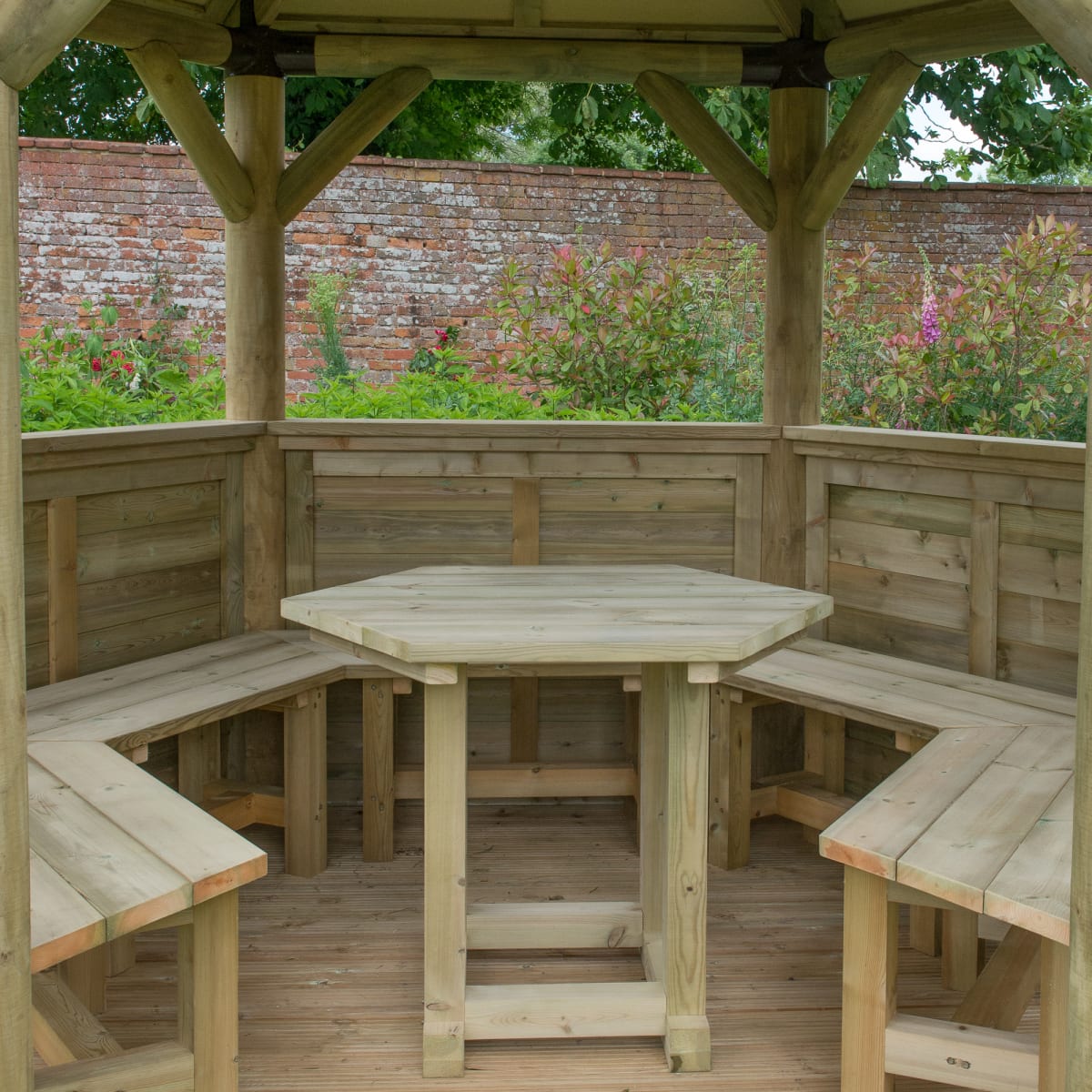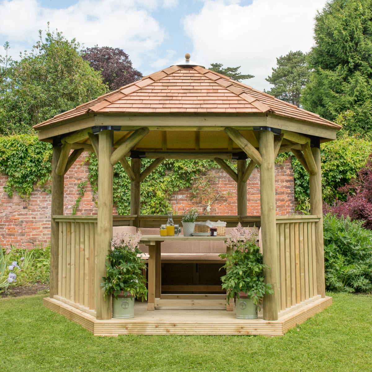 - The 3.6m Furnished Hexagonal Wooden Garden Gazebo with Cedar Roof is perfect for outdoor dining