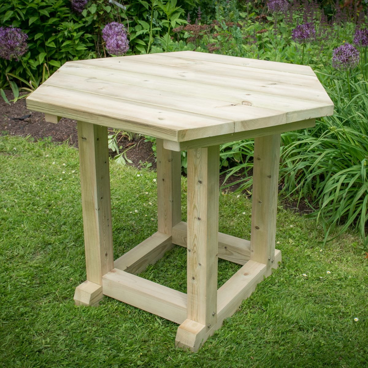 - Includes a hexagonal table and set of 5 matching bench seats that can accommodate up to 10 adults or 14 children