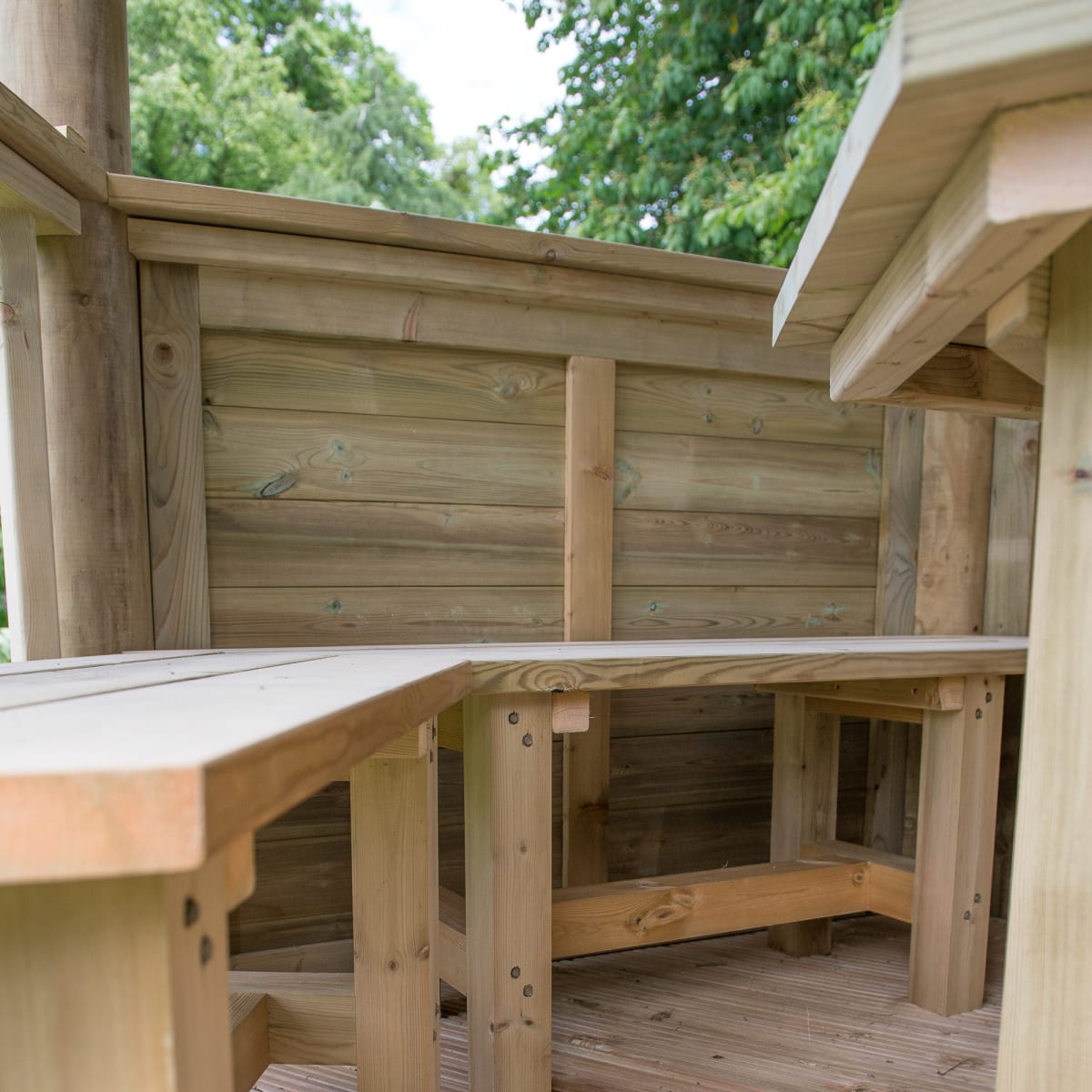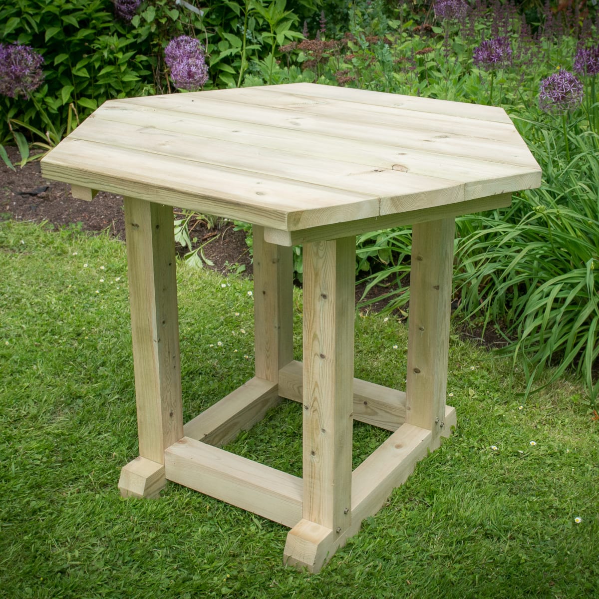 - Includes a hexagonal table and set of 5 matching bench seats that can accommodate up to 10 adults or 14 children