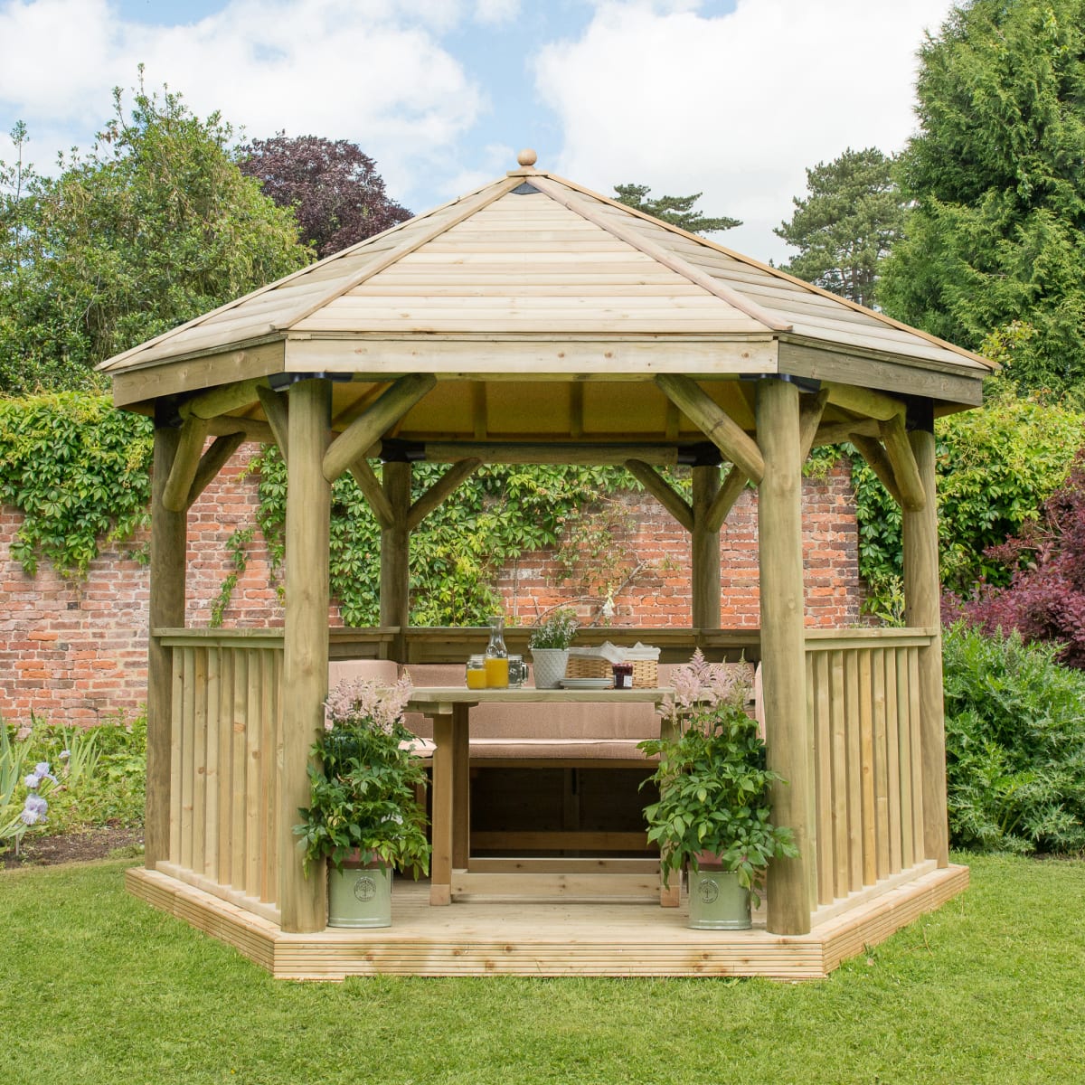 - The 3.6m Furnished Hexagonal Wooden Garden Gazebo with Timber Roof is perfect for outdoor dining
