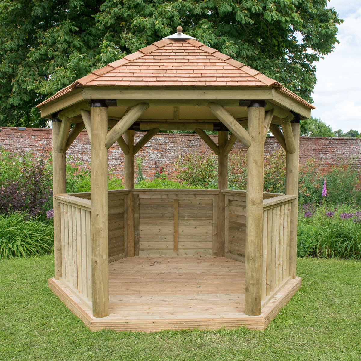 Western Red Cedar shingles are hand cut to size and fitted around the roof – placed on top of a water-proof Tricoya lining. The tiles are red in colour and give the Gazebo an elegant, contemporary look.