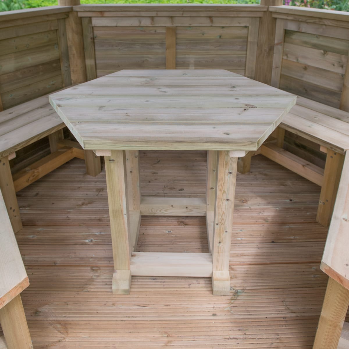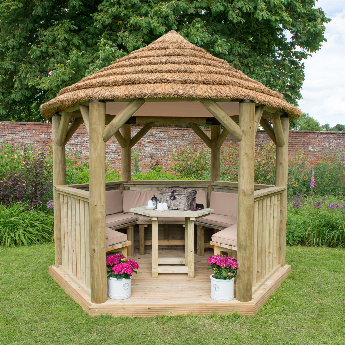 - The 3m Furnished Hexagonal Wooden Garden Gazebo with Thatched Roof is a compact but striking garden feature