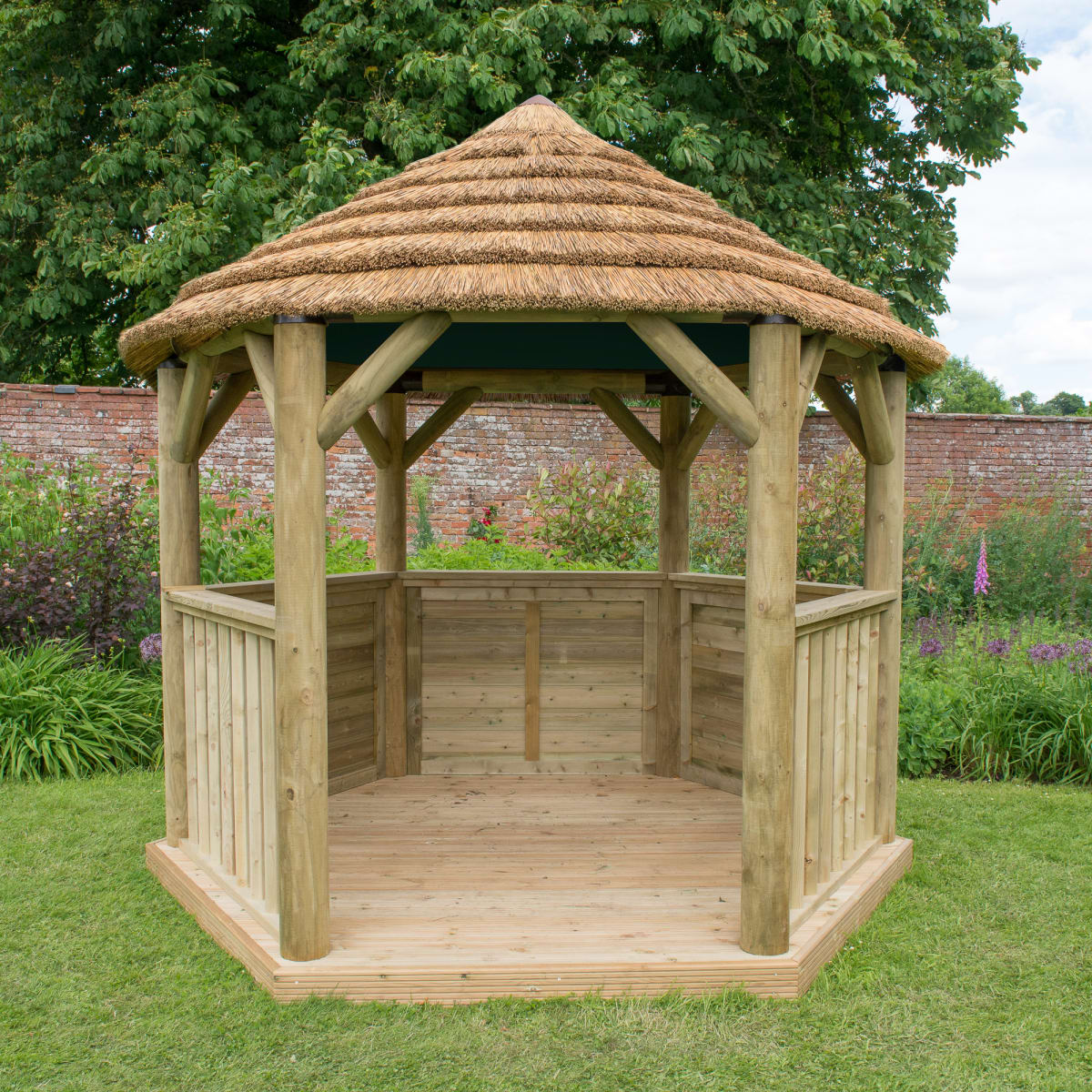 This stylish Gazebo comes with a Thatched roof made from high quality natural South African reed that is layered around the roof for a classic finish. The inside of the roof is fitted with a green, heavy duty, weather-proof, quality outdoor canvas lining.
